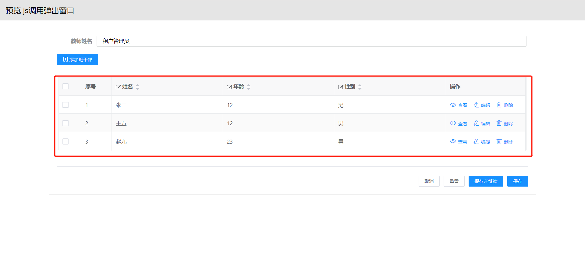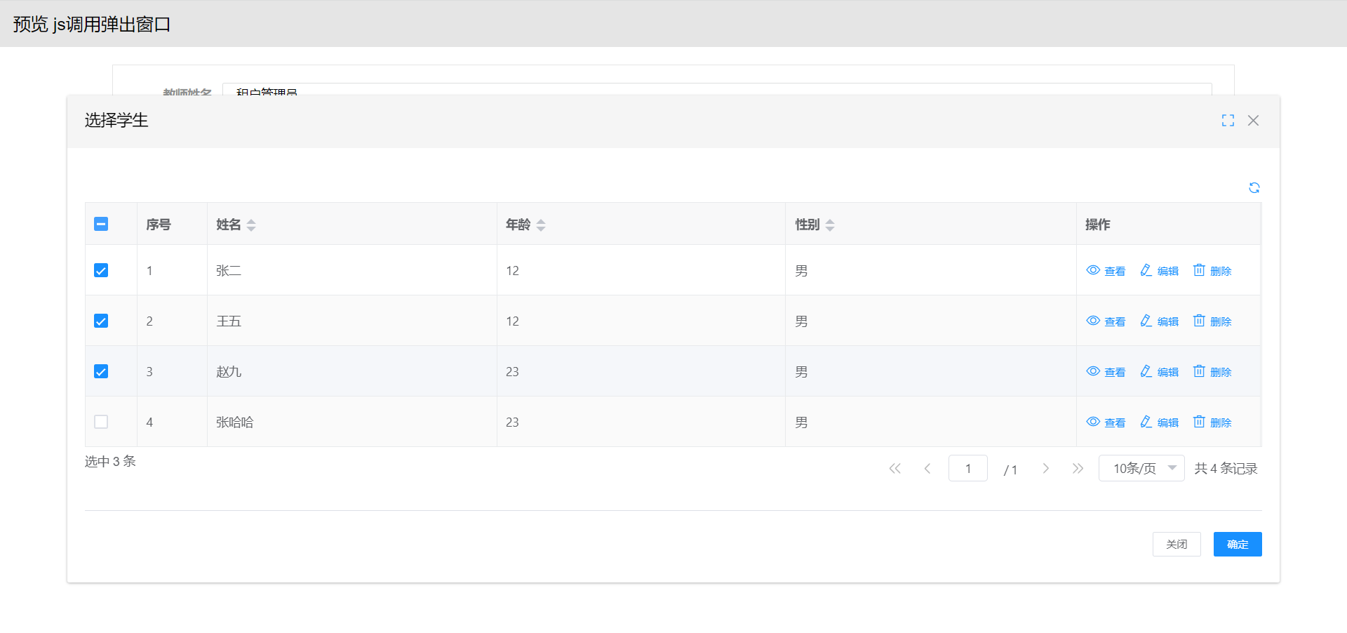 使用场景:教师点击表单添加学生班干部按钮,弹出学生信息列表,选择多条学生信息后将学生信息回填到表单上学生班干部列表中。