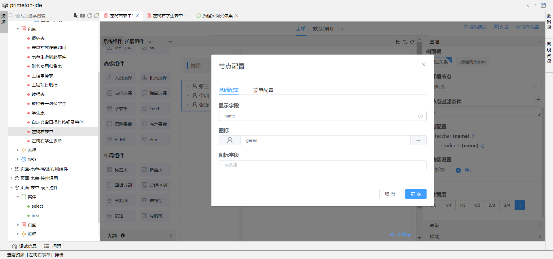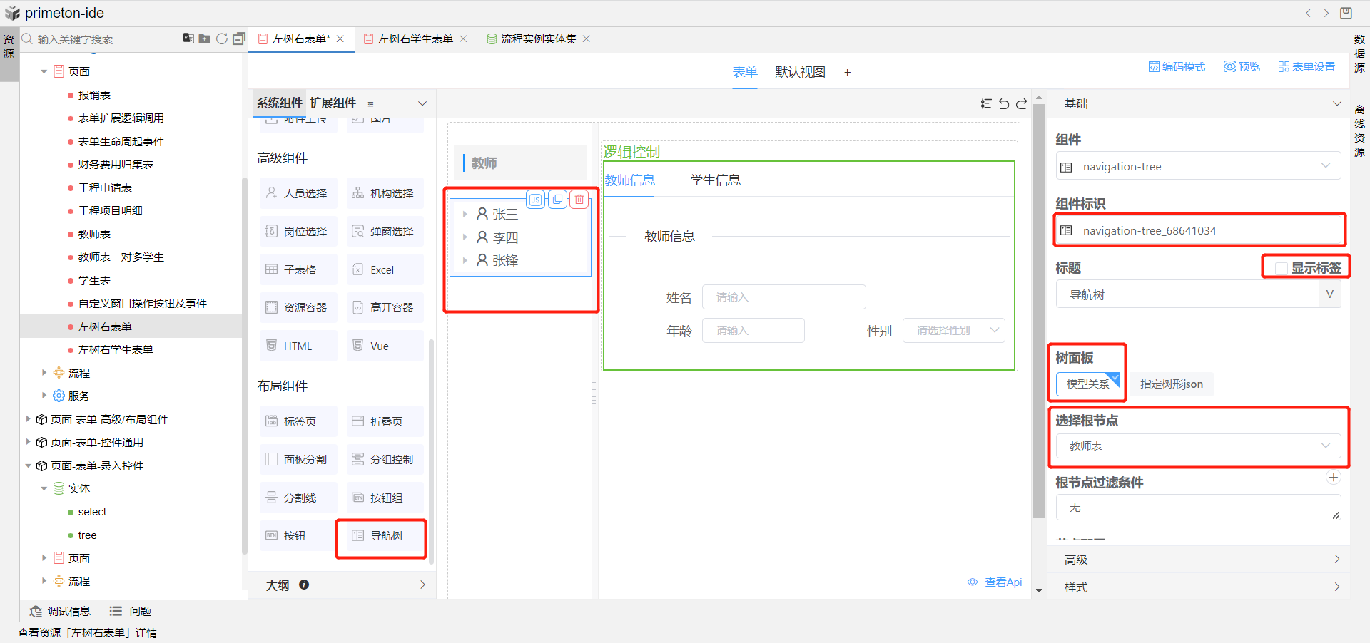 使用场景:表单页面布局划分,左侧树形导航展示教师姓名列,点开后下方展示教师下的学生姓名列,右侧展示教师信息详情表单,点击学生姓名右侧切换展示学生信息详情表单。导航树上可做新增、删除学生操作。