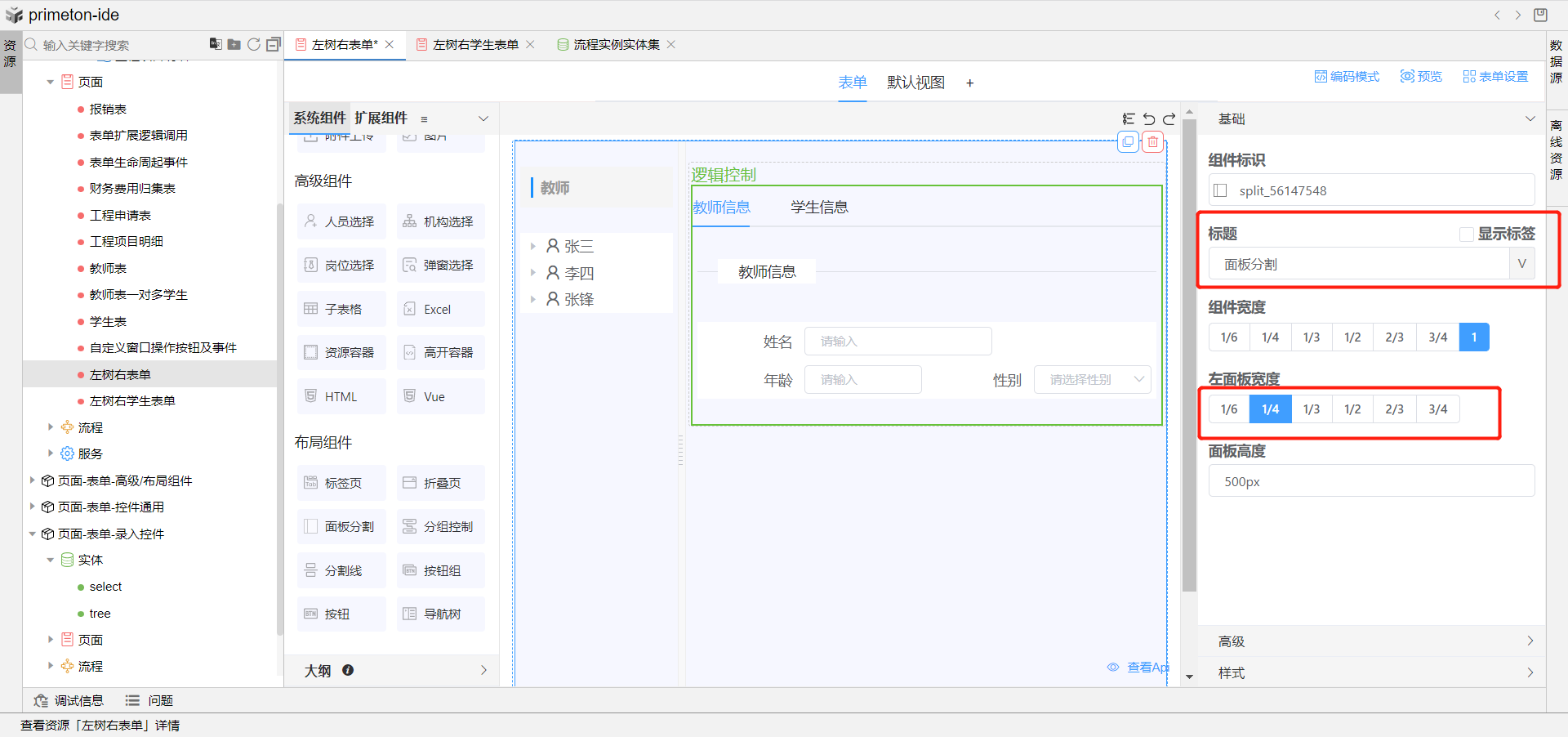 2.再次使用教师持久化实体创建一表单用于作为左树右表单页面,拖选面板分割组件到表单编辑器中,设置左面板宽度为1/4。