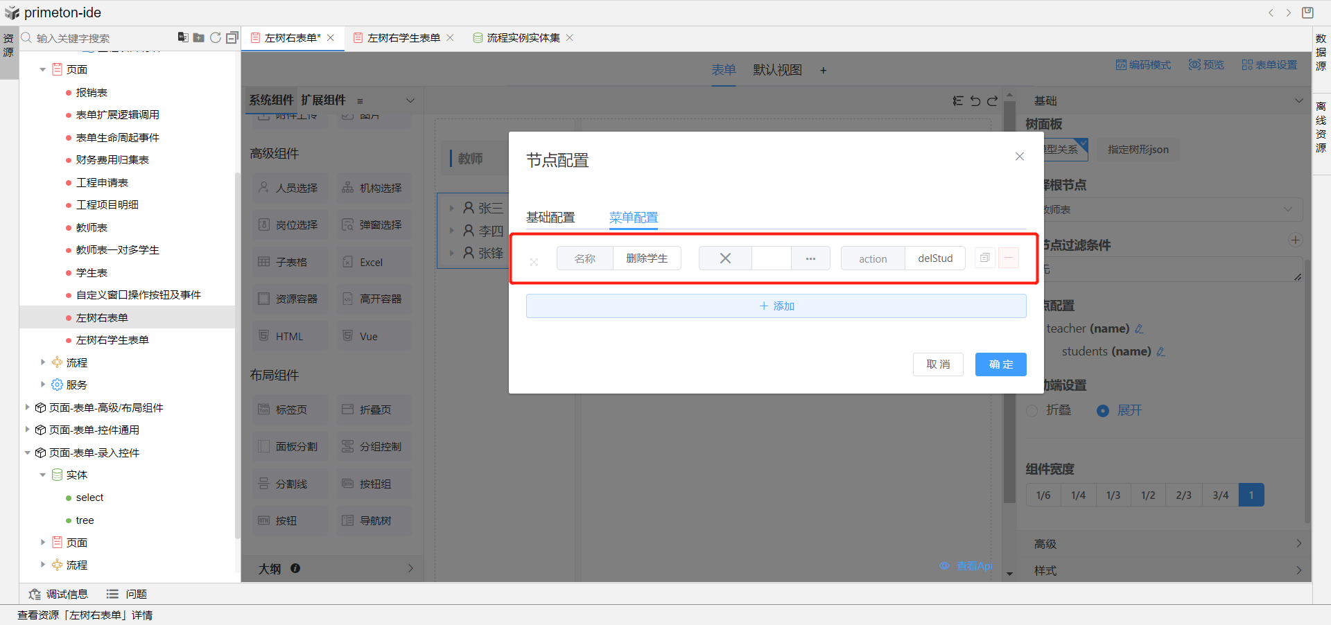 4.拖选分割线组件到左侧面板,设置文字位置居左,使用风格2。拖选导航树组件到到左侧面板位于分割线下,取消勾选显示标签。树面板使用模型关系,根节点使用教师持久化实体,节点配置这里会自动帮我们读取模型关系,建立树形结构,点击teacher节点配置后的编辑图标,打开编辑弹窗,配置显示字段与图标,然后在菜单配置tab页添加新增学生菜单名称、图标、还有动作编码addStudent。students节点配置同样操作,菜单配置添加删除学生菜单名称、图标和动作编码delStudent。