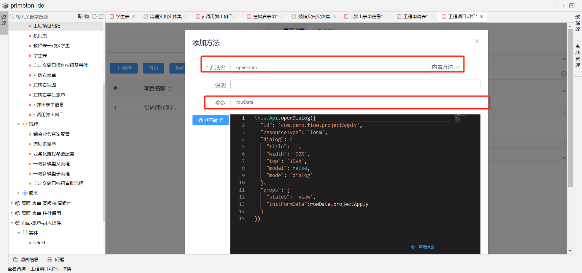 2.进入工程项目视图中,点击视图设置,选择高级设置模块,添加方法openFrom,方法区写入如下js,调用该方法时将当前行的工程信息传入工程表单并打开工程表单只读弹窗。