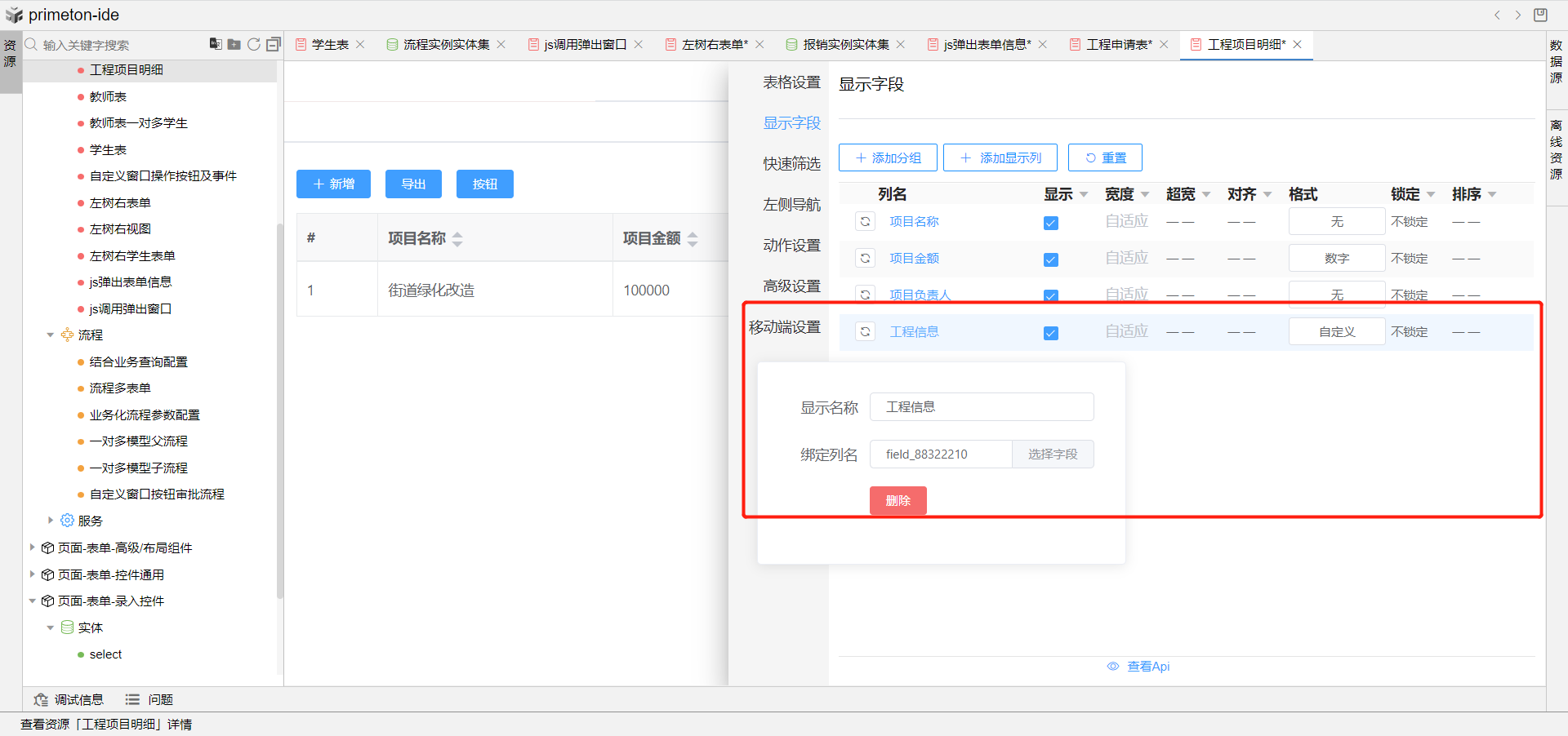 使用场景:工程表与工程项目表为双向1:n关联关系,在工程项目视图行中点击工程信息列中的查看工程链接,弹出表单展示该工程项目的具体工程信息。