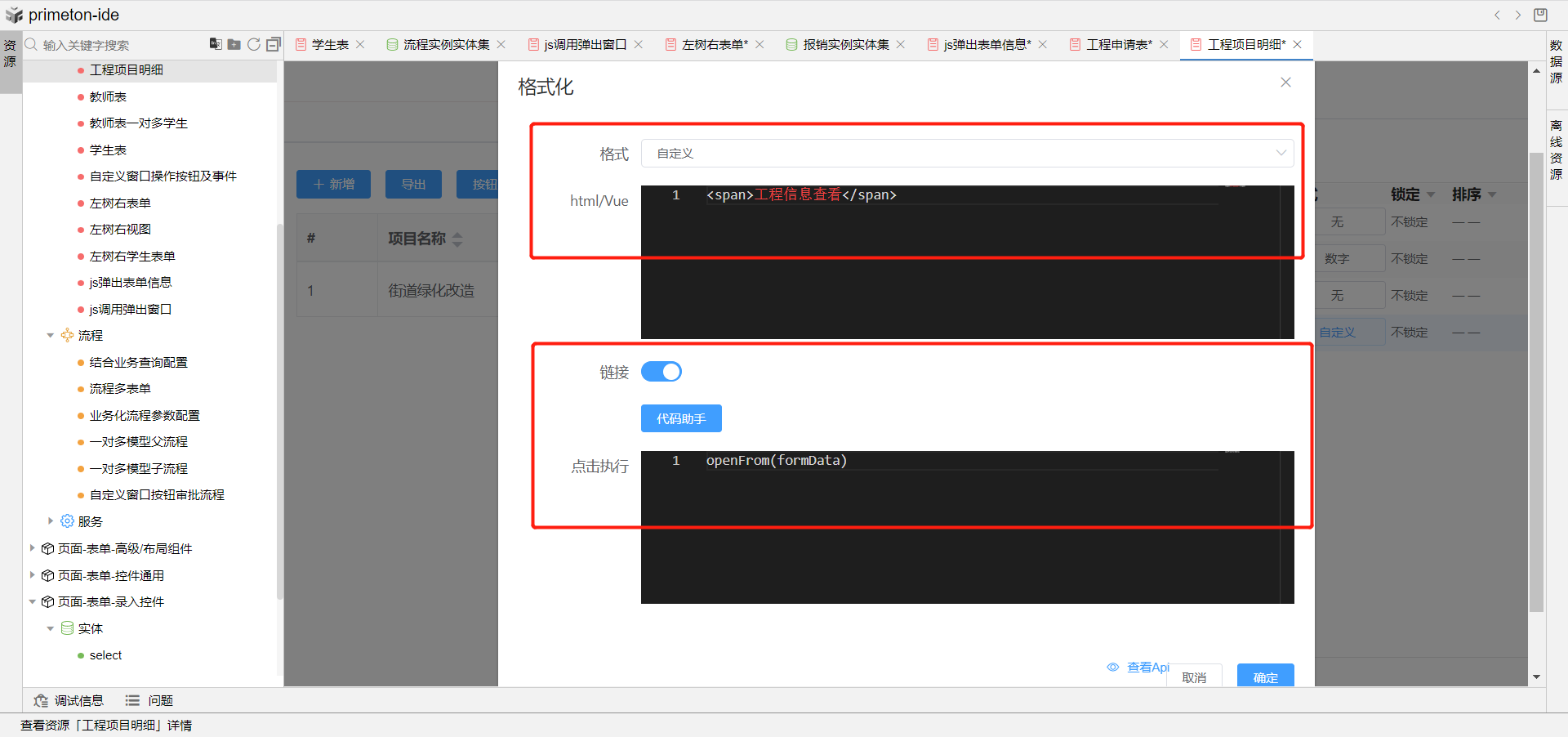 4.打开链接开关,在链接下方代码块中调用刚刚定义的openForm()方法,并传入当前行对象formData.