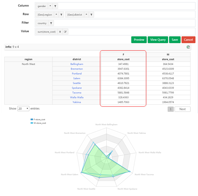 如下图所示,明细表和交叉表在同时限定维度年与性别的情况下,明细表会返回大量没有经过聚合的重复数据,交叉表返回的则是对两个维度进行聚合之后的结果集。