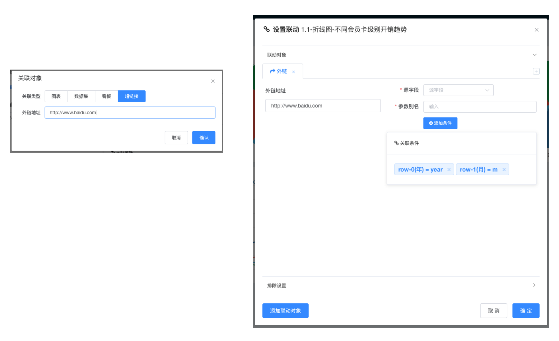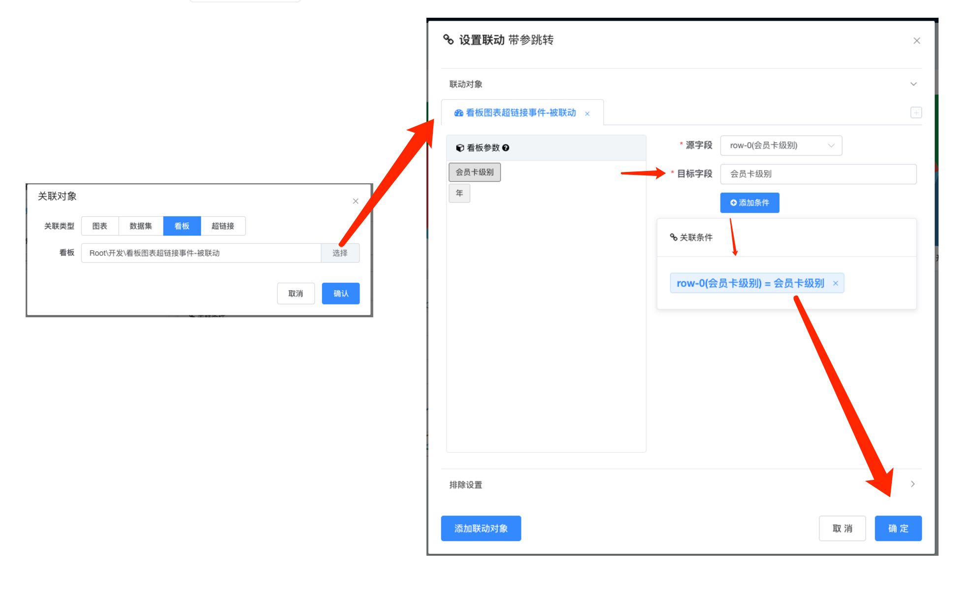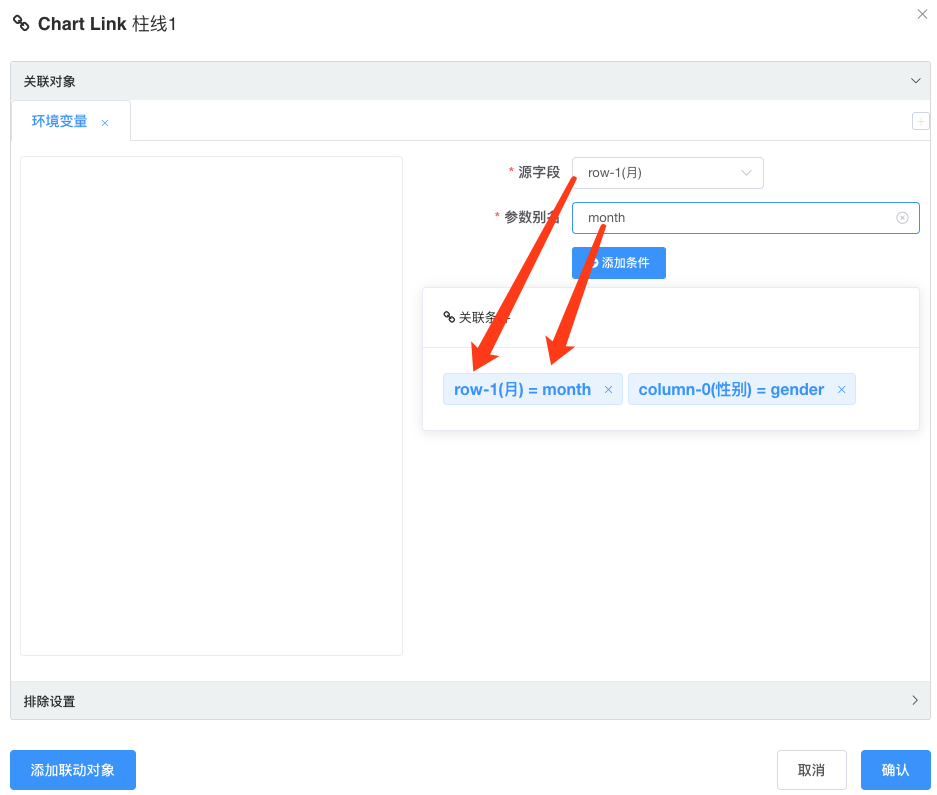 - 选择源字段(来自源图表行列维度), 对于 KPI 指标卡之类没有行列维度在图上显示的可以选择常量