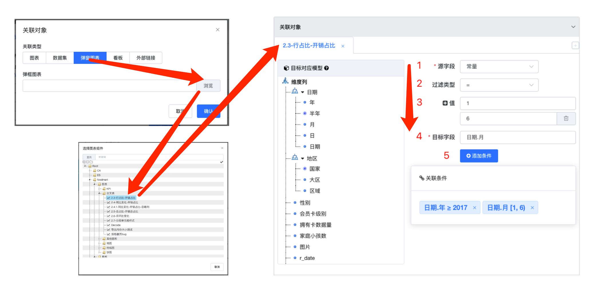 - 选择关联对象 目标字段: 目标字段与目标对应的数据集或者 AD-HOC 查询相对应, 目标字段通过点击左侧模型树节点选择;