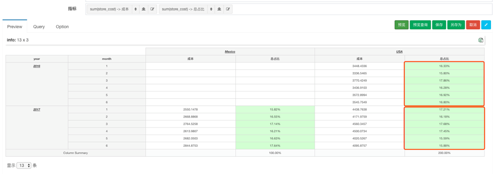 在原始值基础之上, 只需简单对指标进行值类型设置之后原始数值将进行相应换算成占比, 同比, 环比等;