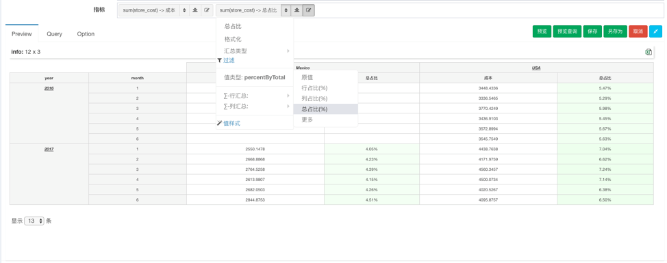 当我们有了原始的交叉表表格之后,可以对表格上的数据(视图数据)进行二次加工,快速值类型转换计算行列占比、总占比等