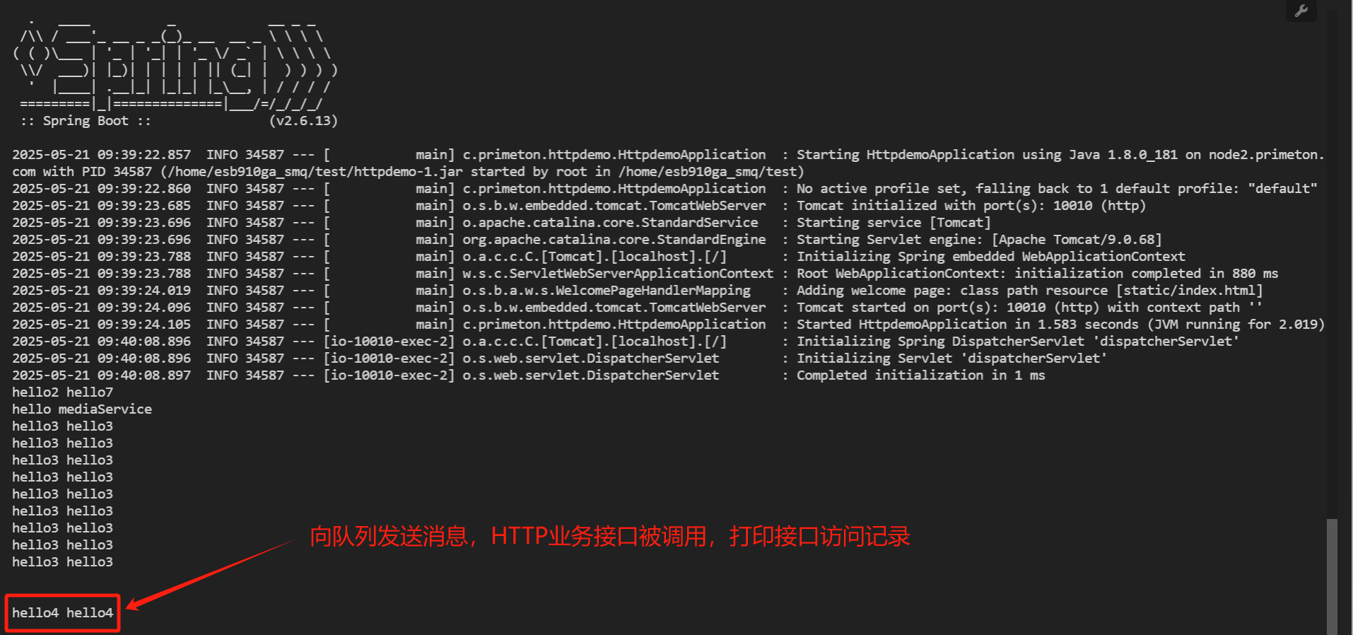 生产完消息后可在httpdemo-1.jar的控制台查看到相应接口请求的打印消息。