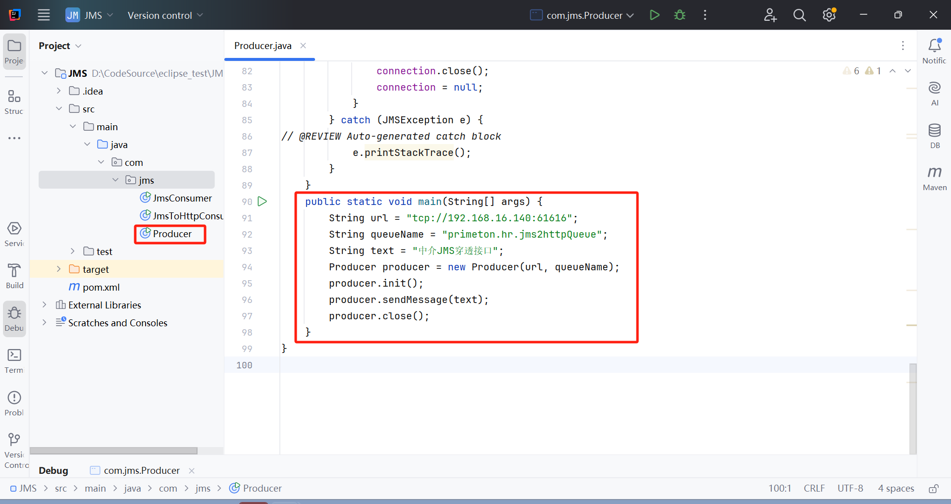 修改Producer类(类路径:com.jms.Producer)Main方法中的属性。