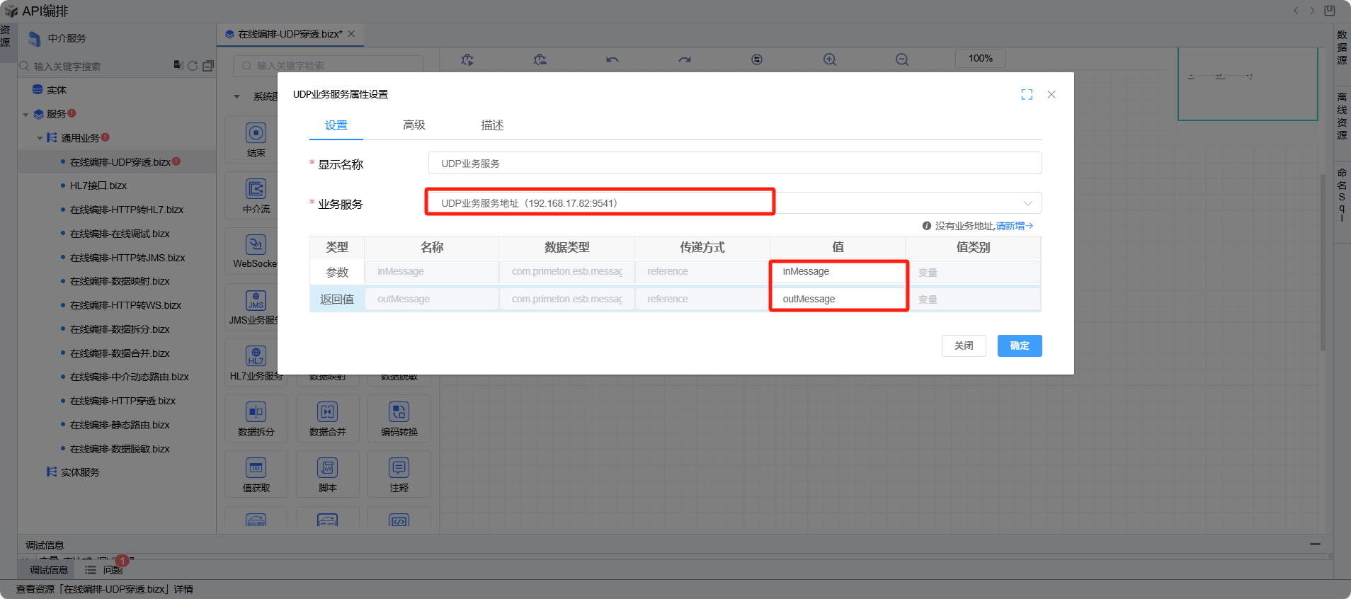 双击打开 UDP业务服务 图元,业务地址下拉框选择中介UDP业务服务地址,下方表格中的参数和返回值分别选择inMessage和outMessage,然后点击确定按钮关闭对话框。如下图: