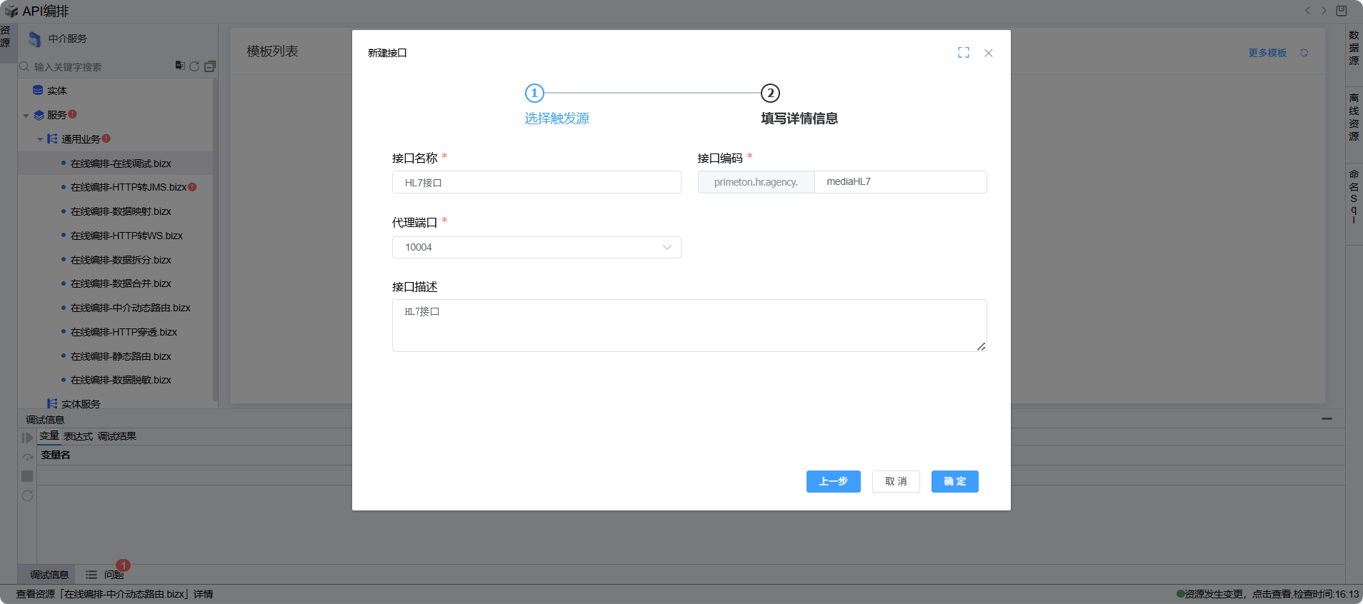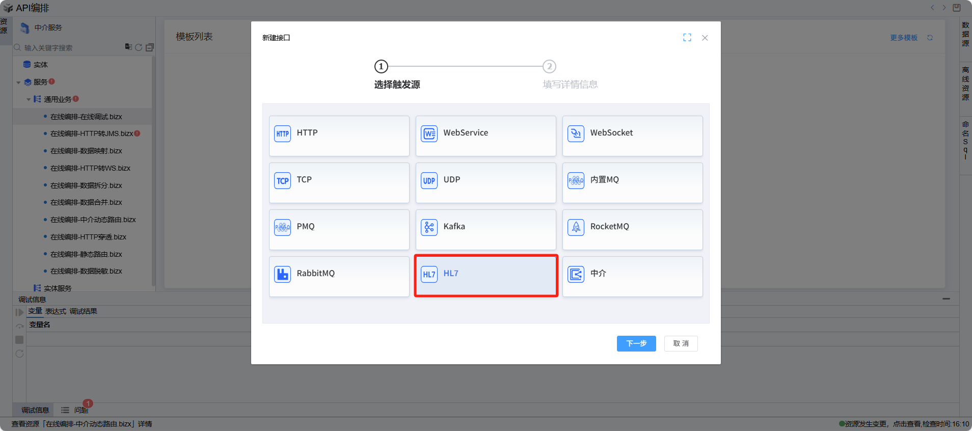 在“新建API接口”页面,选择“HL7”选项,并点击“下一步”按钮,进入接口信息填写页面。