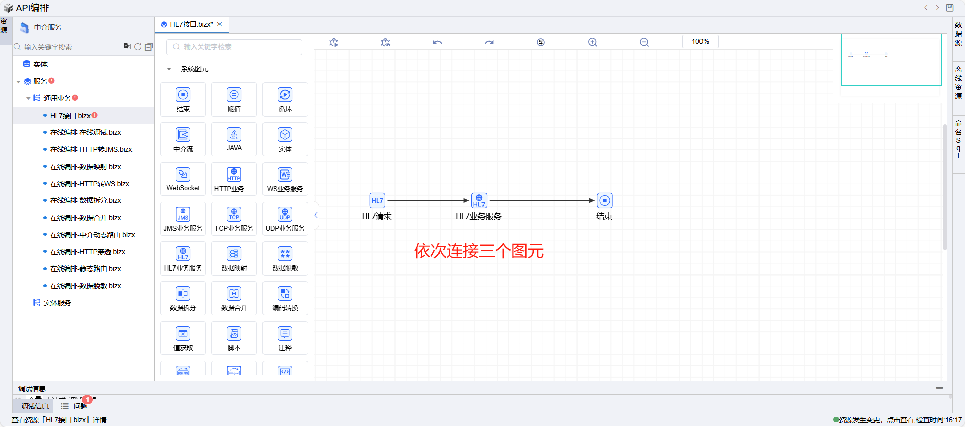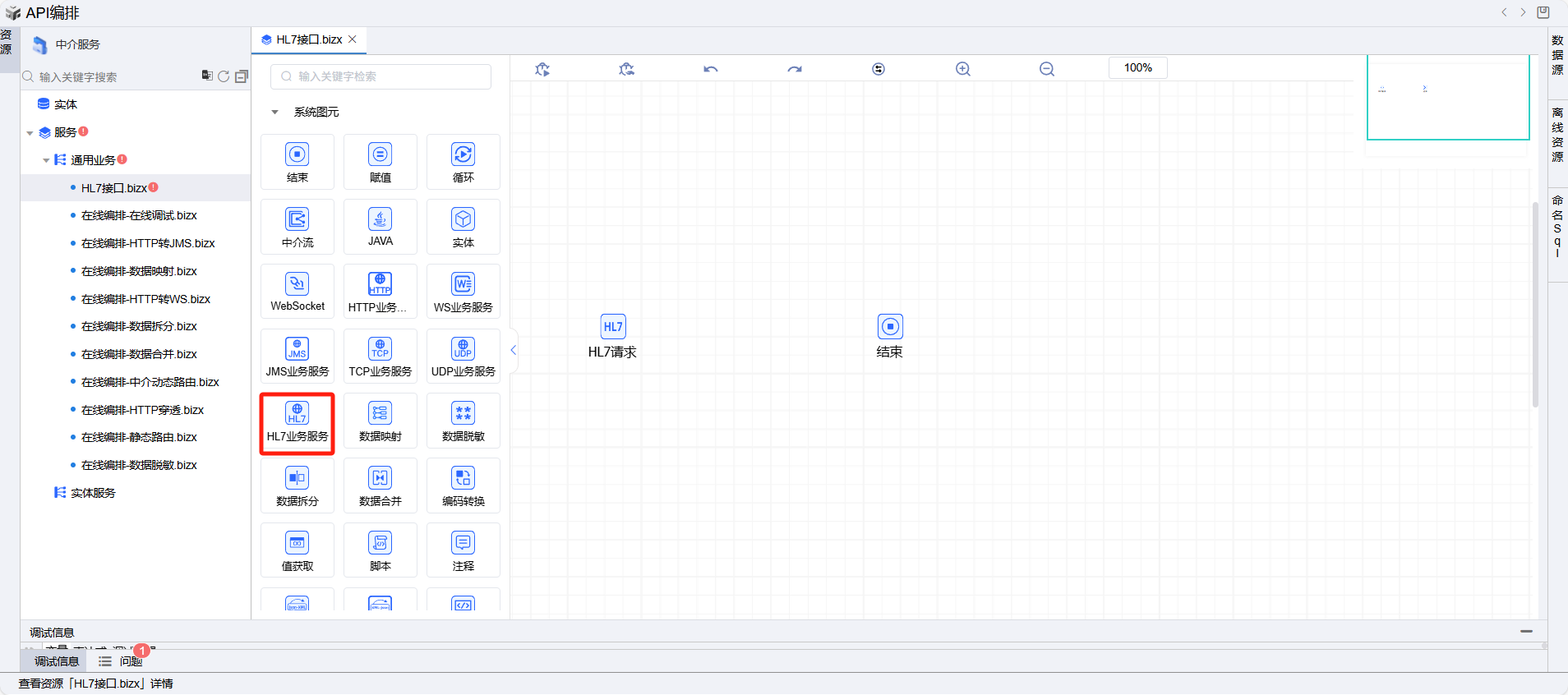 保存成功后系统自动打开中介编排页面,如下图所示。从左侧拖一个HL7业务服务图元到编辑区域。