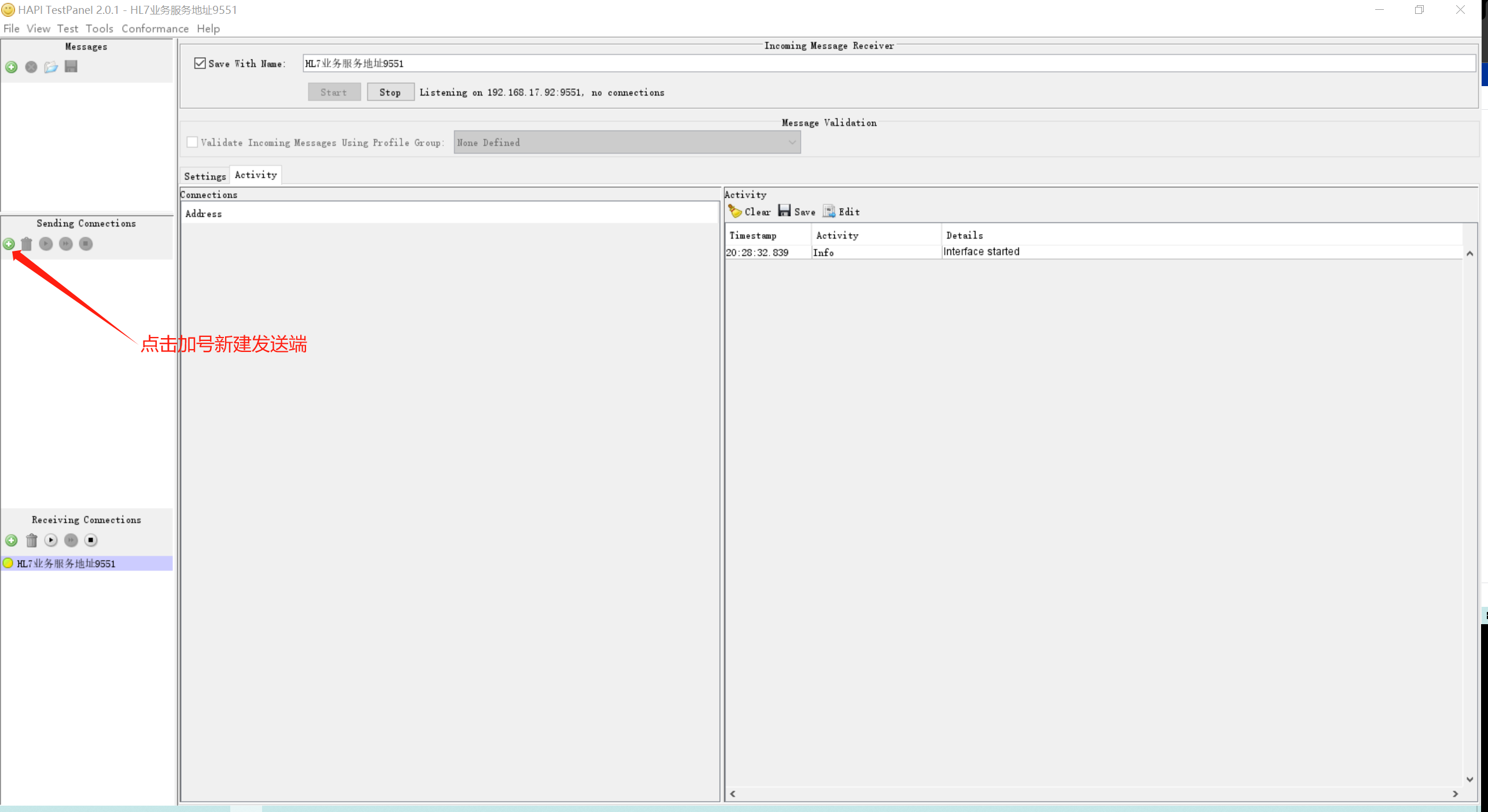 2. 在TestPanel中,点击左边的加号,新建一个消息发送器。如下图所示: