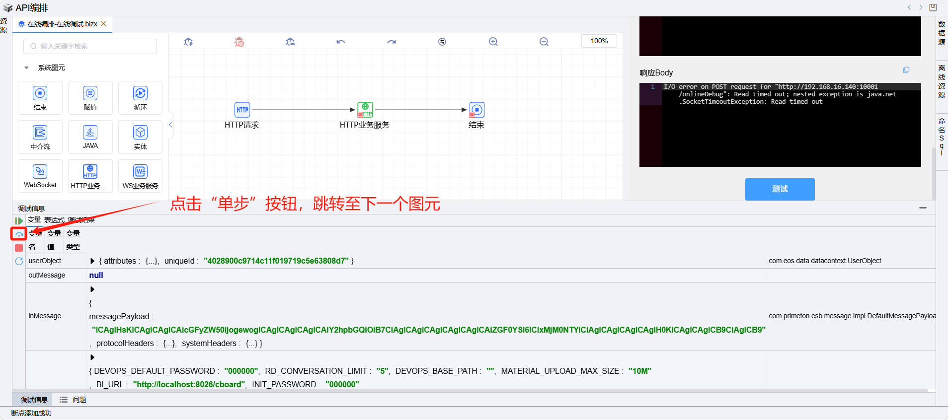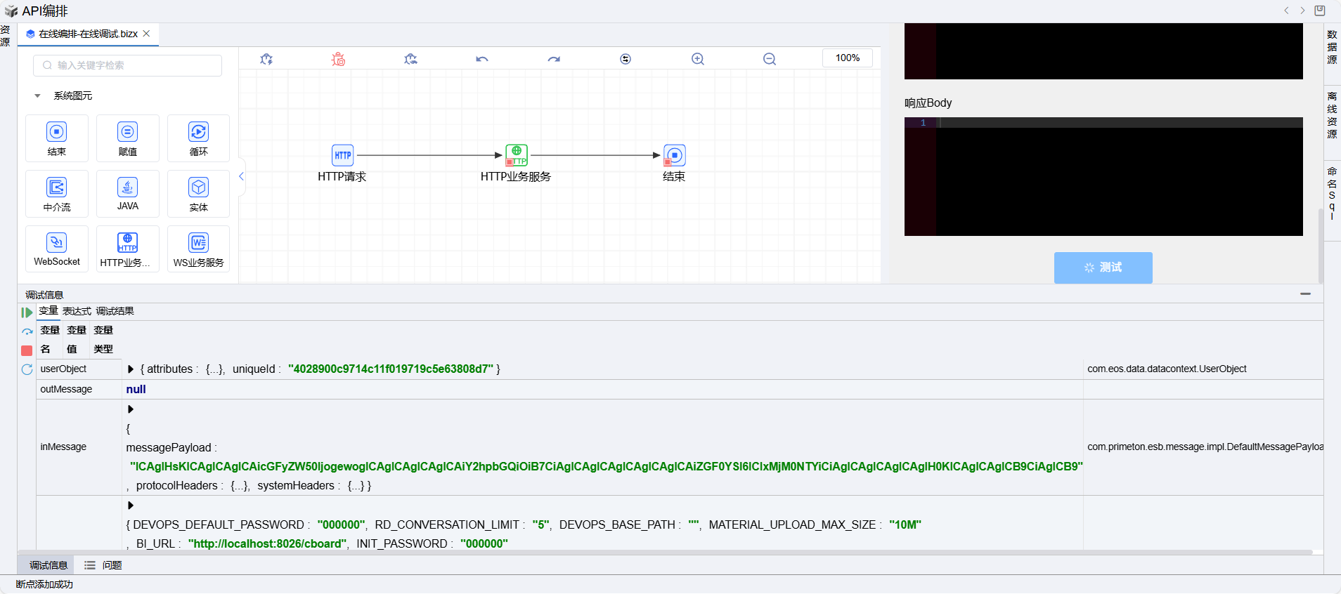 点击测试后,可以看到在线编排页面,已经来到第一个断点,可在“变量”界面查看当前变量信息。