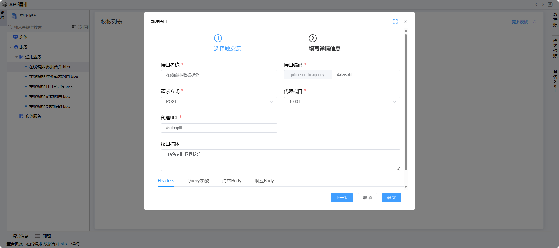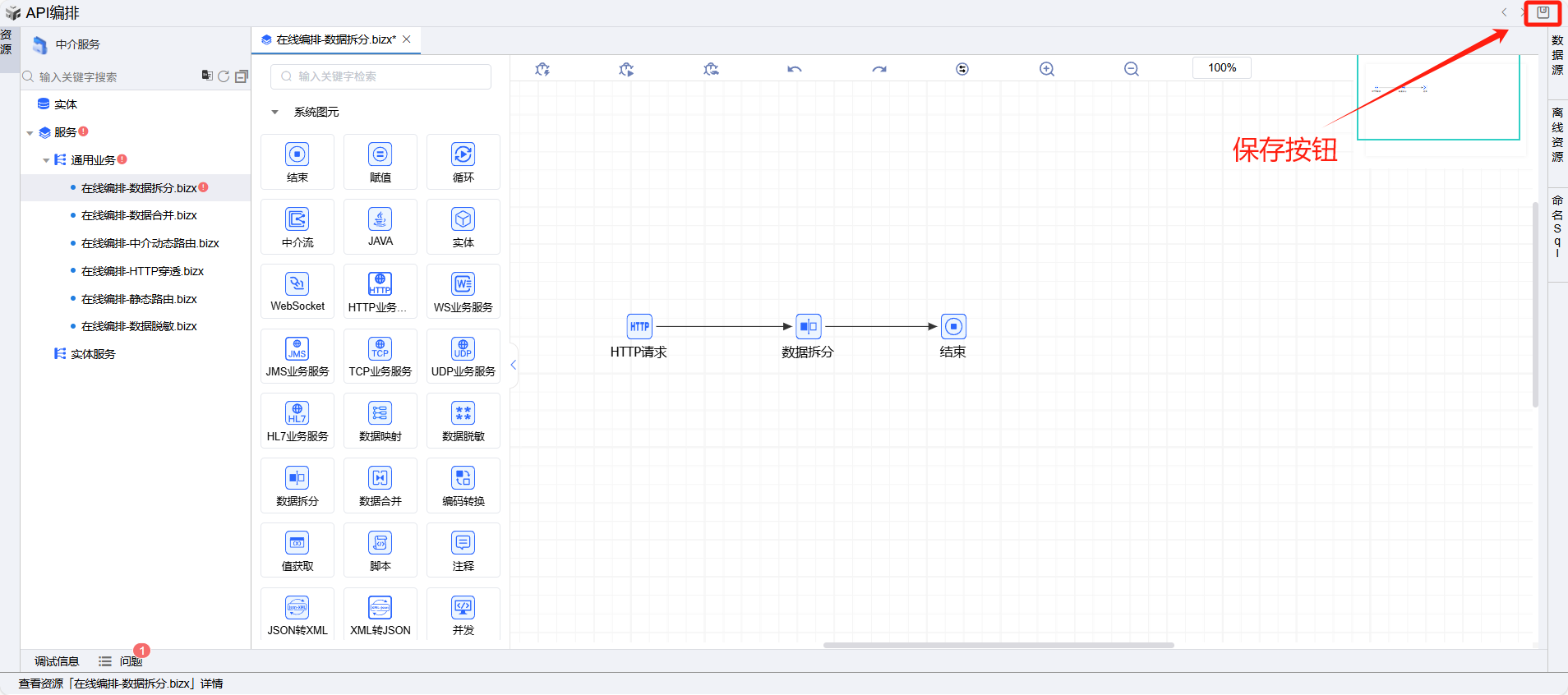 1. 选择左侧树上“中介服务”节点,点击右侧“API编排”按钮,进入在线编排页面。