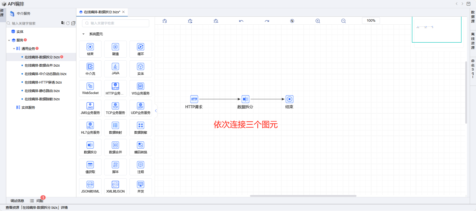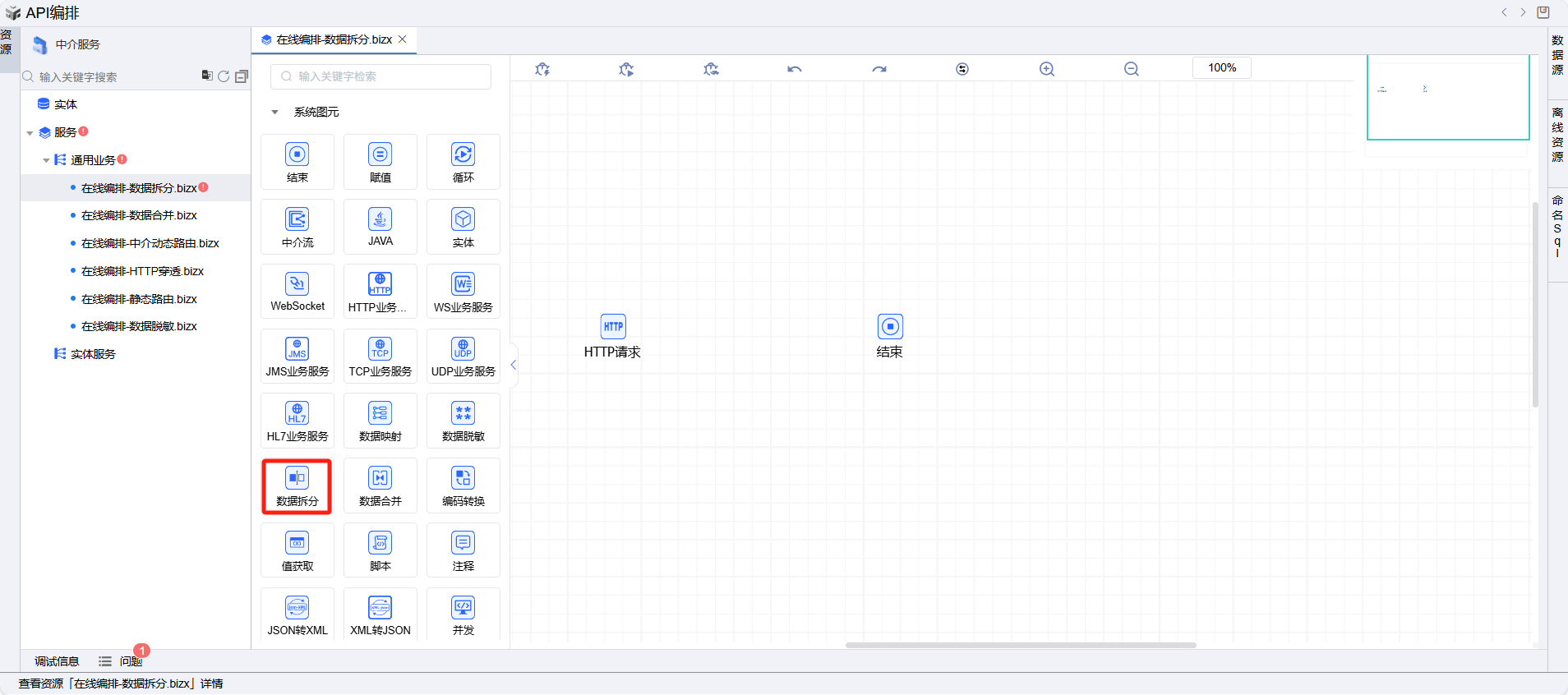 1. 保存成功后系统自动打开中介编排页面。从左侧拖一个 数据拆分 图元到编辑区域。