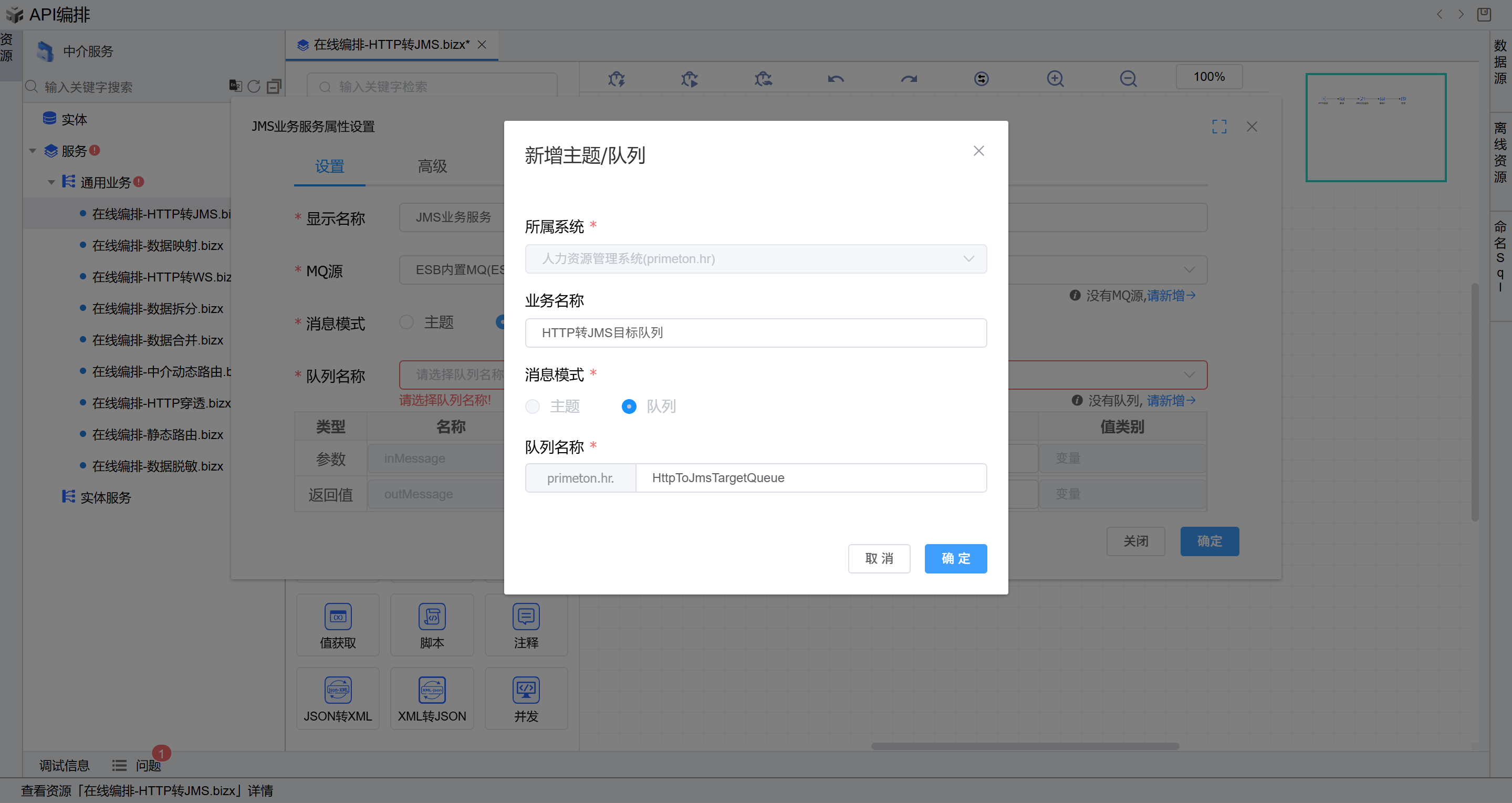双击打开第一个HTTP转JMS图元,配置参数和返回值。如下图: