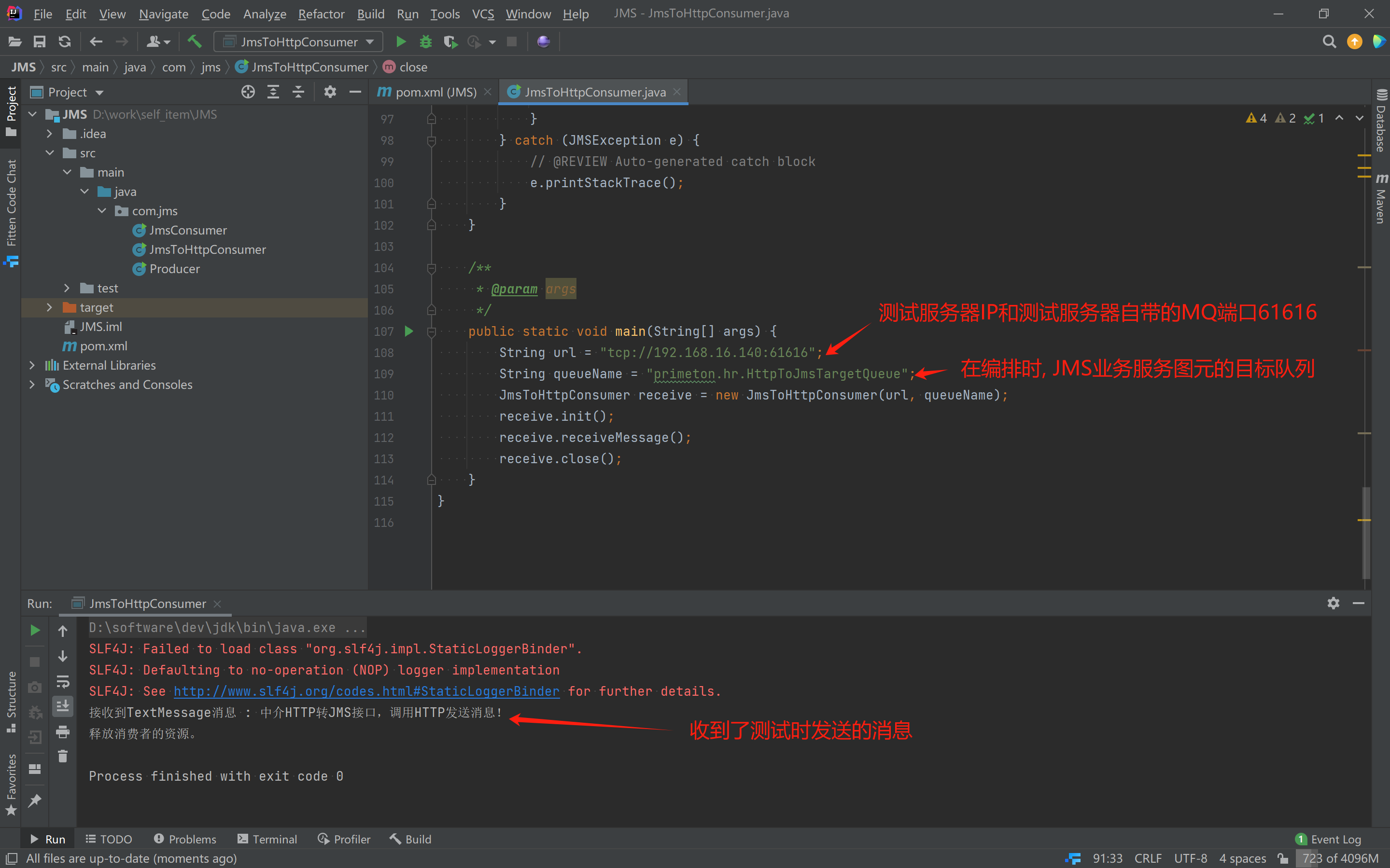 发送消息后下面使用Java代码调用,JMS.zip,下载后使用开发工具打开。 调用JmsToHttpConsumer类的Main方法接收消息,ip为测试服务器IP,端口为61616端口,queueName值为服务编排时,JMS业务服务图元中,填写的目标队列为primeton.hr.HttpToJmsTargetQueue,然后执行Main方法。如下图: