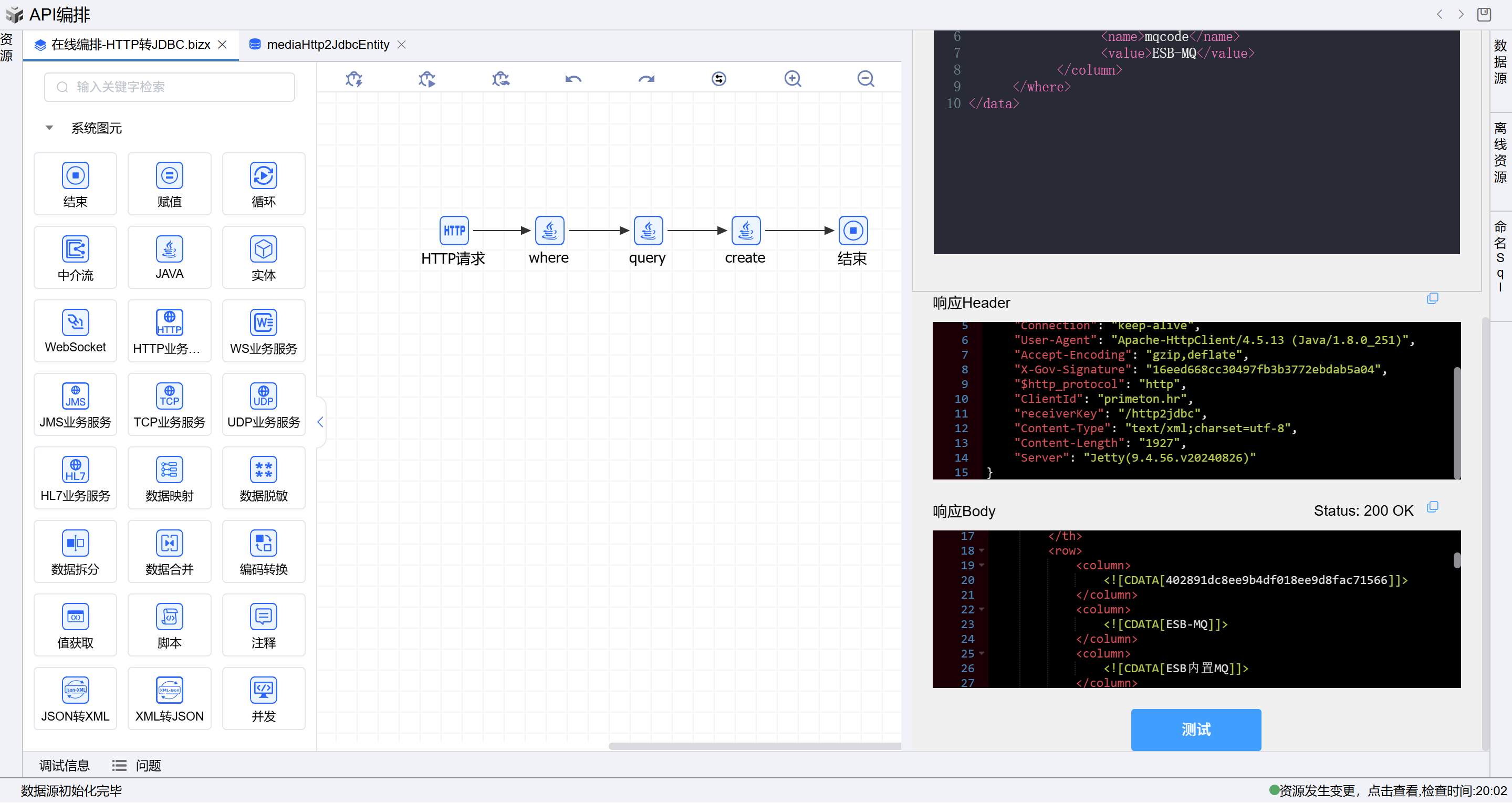 在线编排页面保存成功后,点击界面上方的测试按钮,如下图: