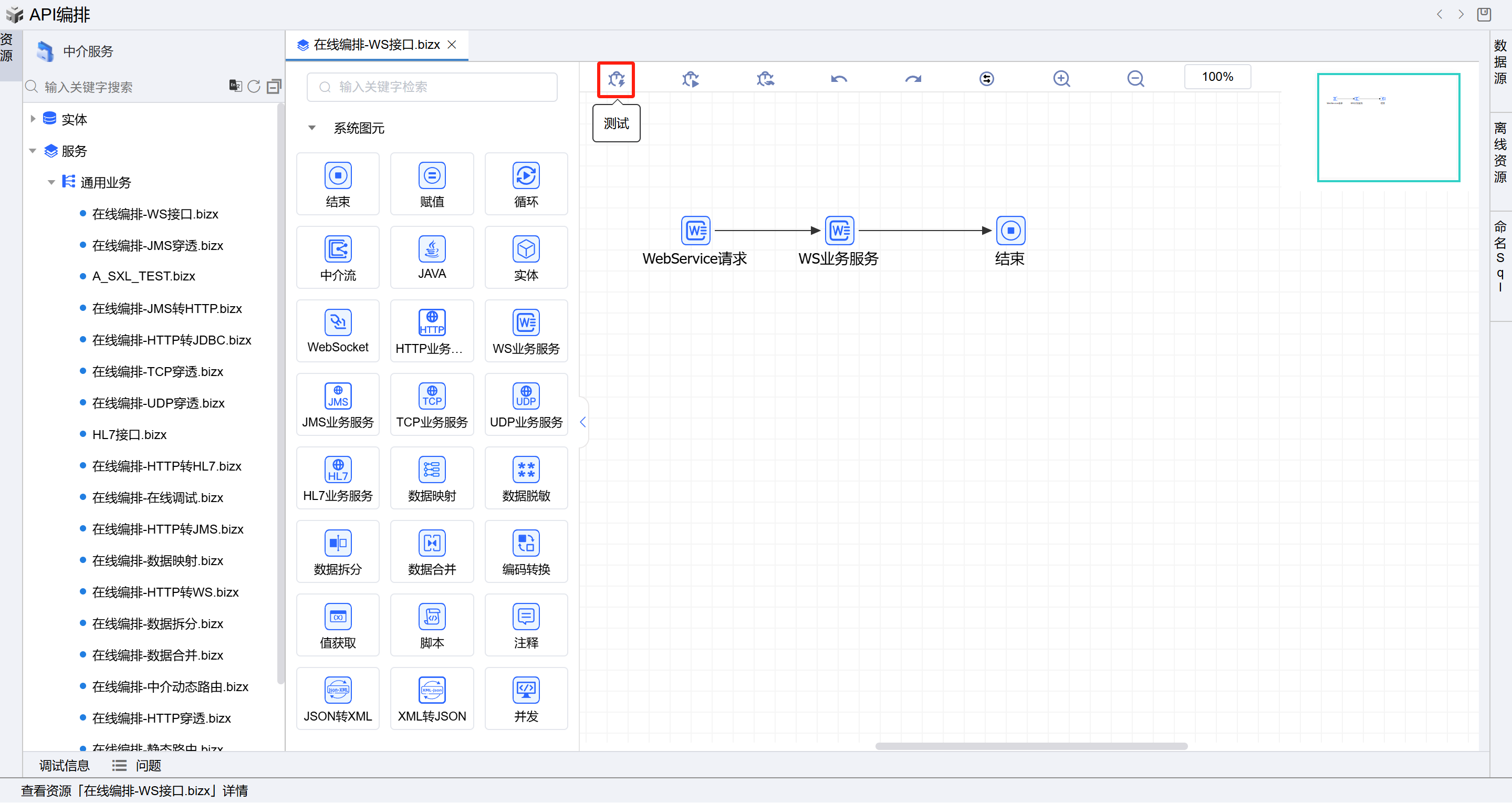 在线编排页面保存成功后,点击界面上方的测试按钮,如下图: