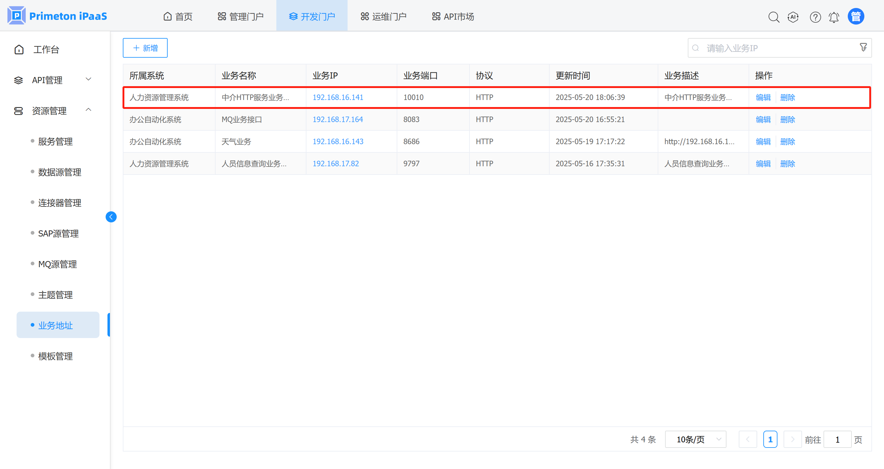 本次我们使用的业务服务为httpdemo-1.jar,打开方式为在命令行下面输入java -jar httpdemo-1.jar。在【资源管理】/【业务地址】页面,新增业务服务地址,点击确定保存。如下图: 注:业务IP和业务端口分别填写运行Jar的服务器的ip和端口10010