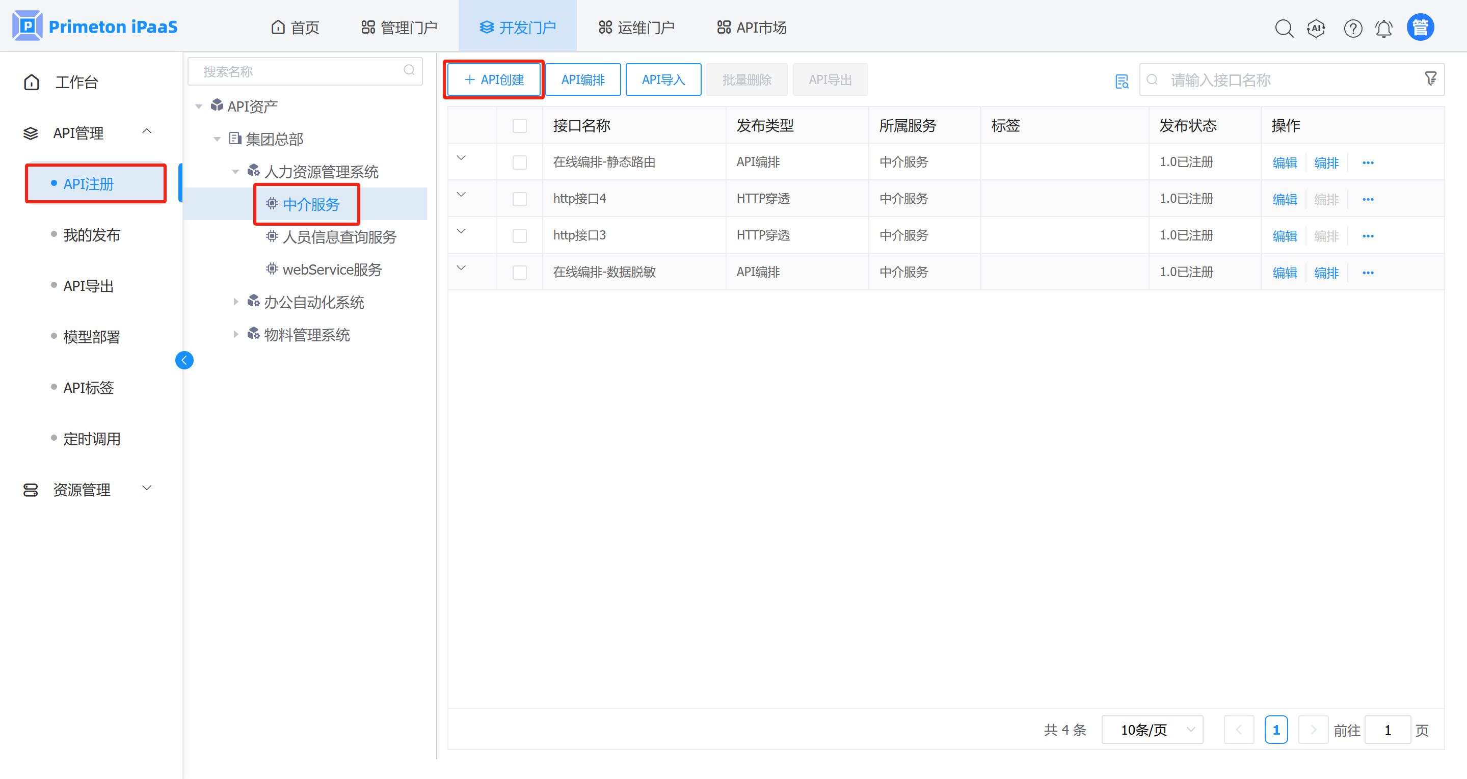 在中介服务下添加这个地址的具体访问URL。点击中介服务后点击右侧的API创建。如下图: