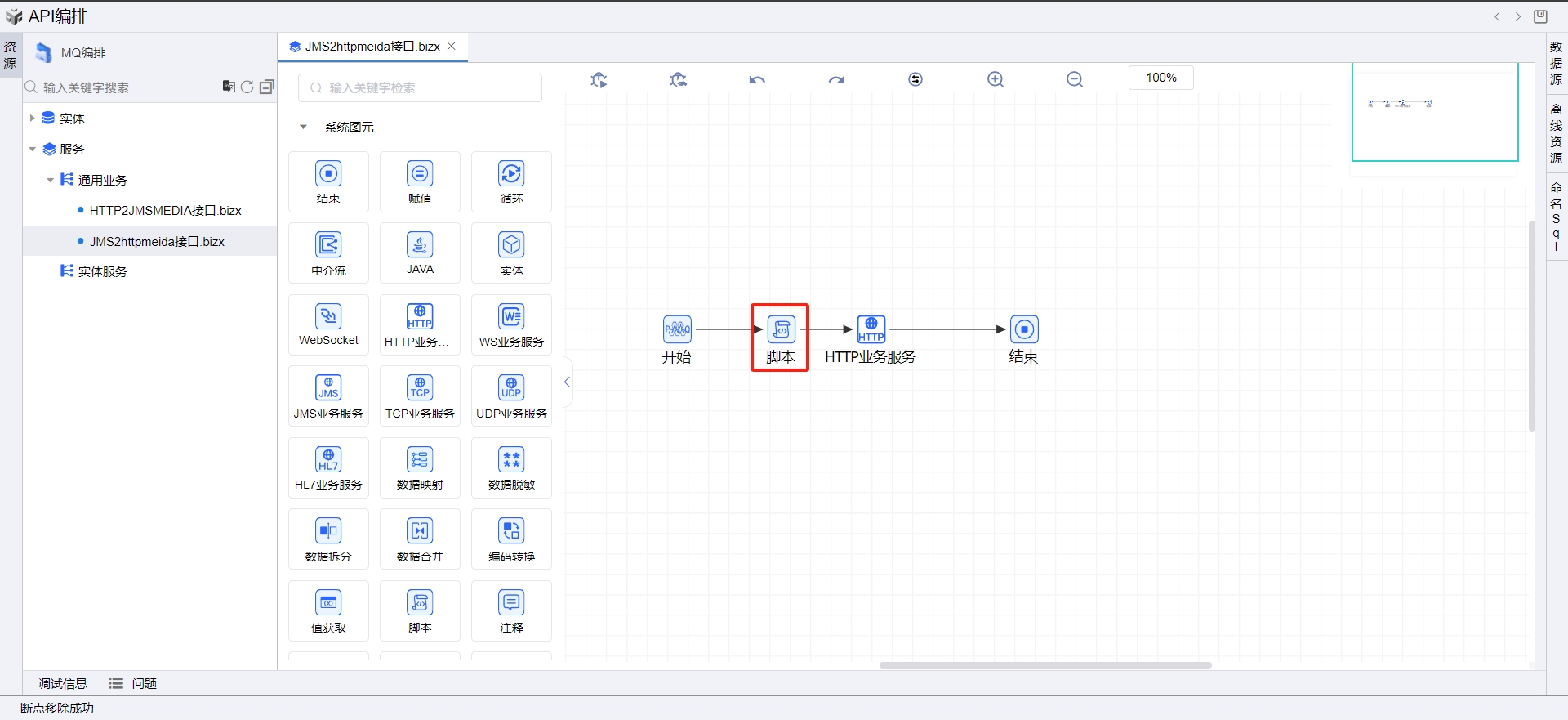 在线编排JMS转HTTP接口,升级后需要修改脚本图元,添加如下两行代码(加这两行的目的是为了记录订阅日志):