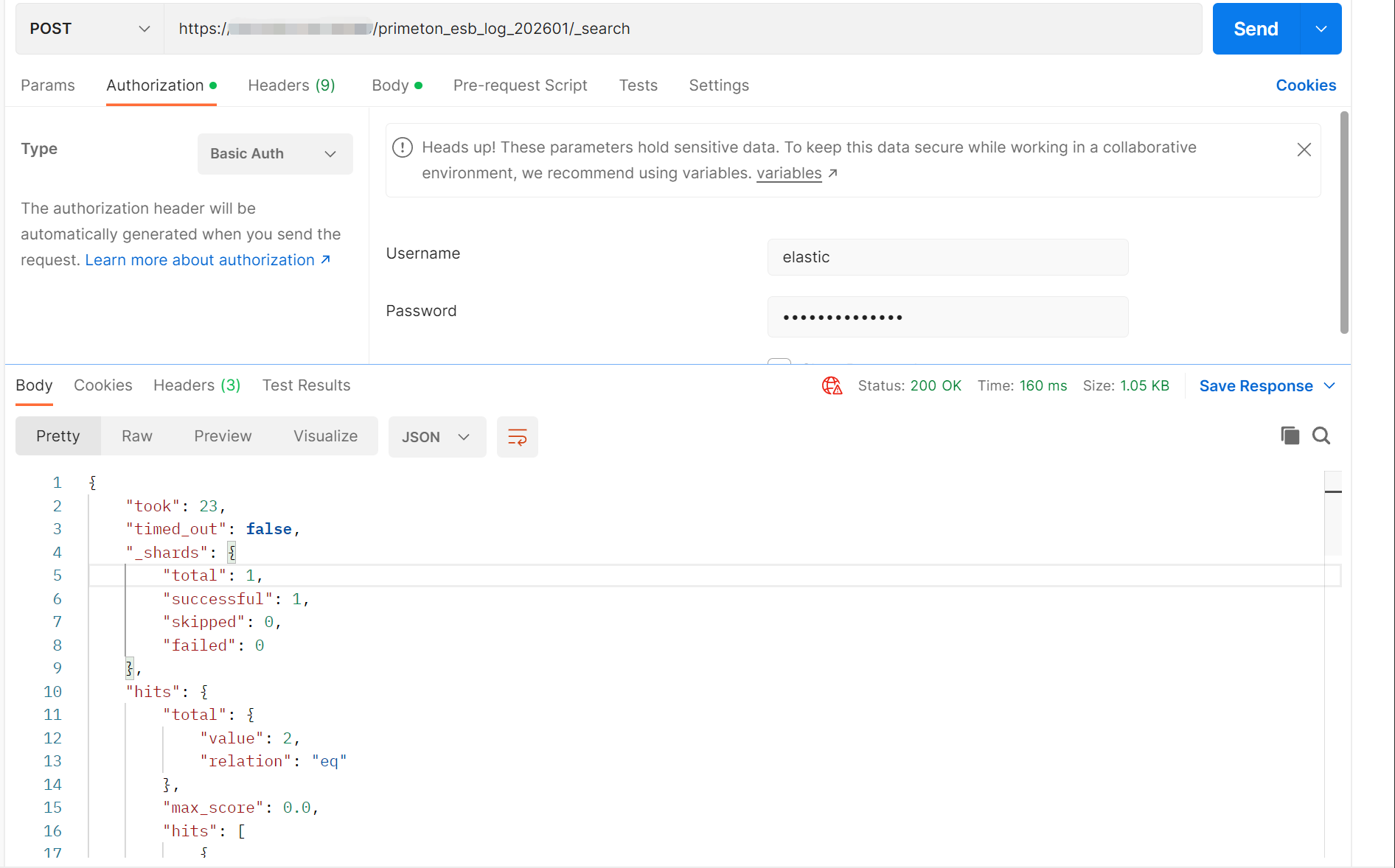 • 接口调用工具访问 ES索引查询数据:请求示例URL:https://ESiP:port/primeton_esb_log_2026xx/_search;