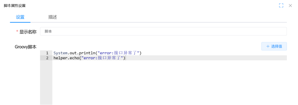 在异常线后的流程中添加 Groovy 脚本图元,通过代码构建并设置输出消息(输入消息的构建方式类似,可参考实现)。