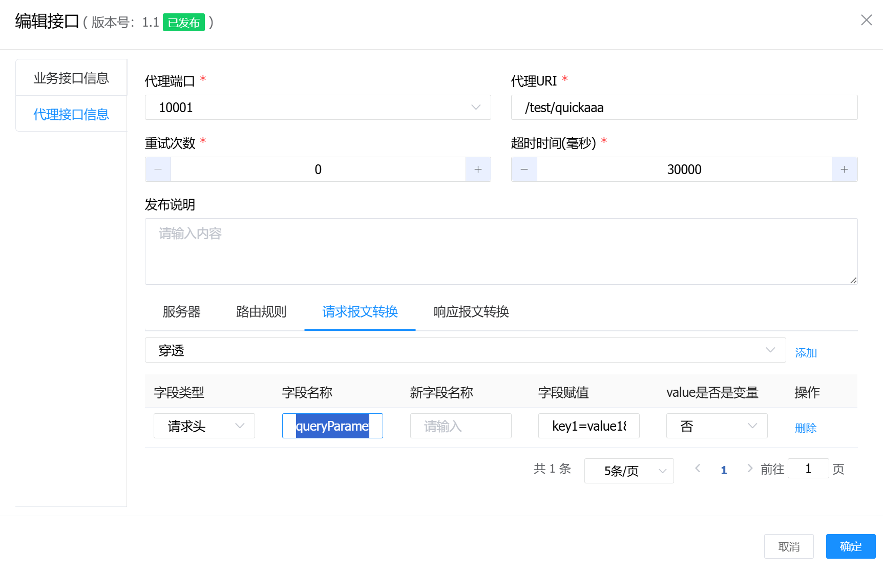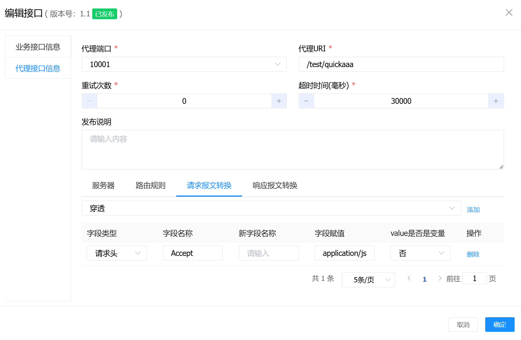 在开发门户-我的发布-编辑接口的“代理接口信息”中,进入“请求报文转换”配置页,手动添加一个请求头: