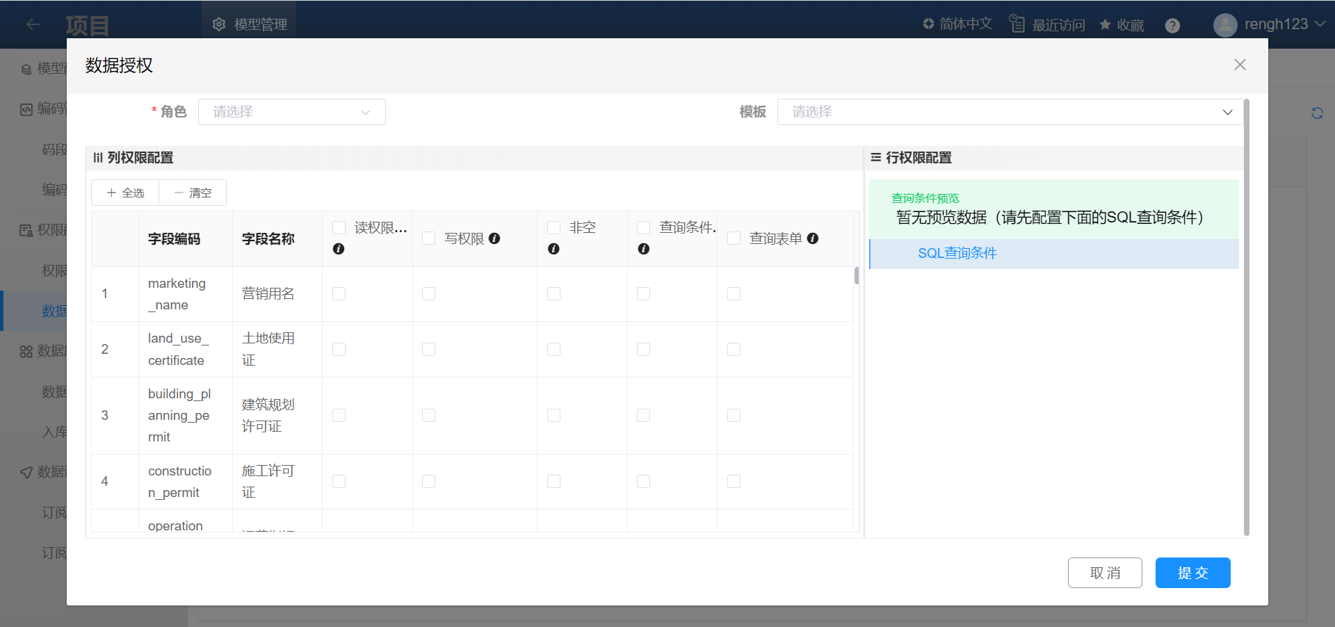 点击【权限配置-数据授权】菜单,进入数据授权页面。点击【新增授权】按钮,弹出新增授权弹框。选择授权的模型角色以及行列权限,点击【提交】生成一条授权记录。拥有该权限的角色将可以看到授权的行列。