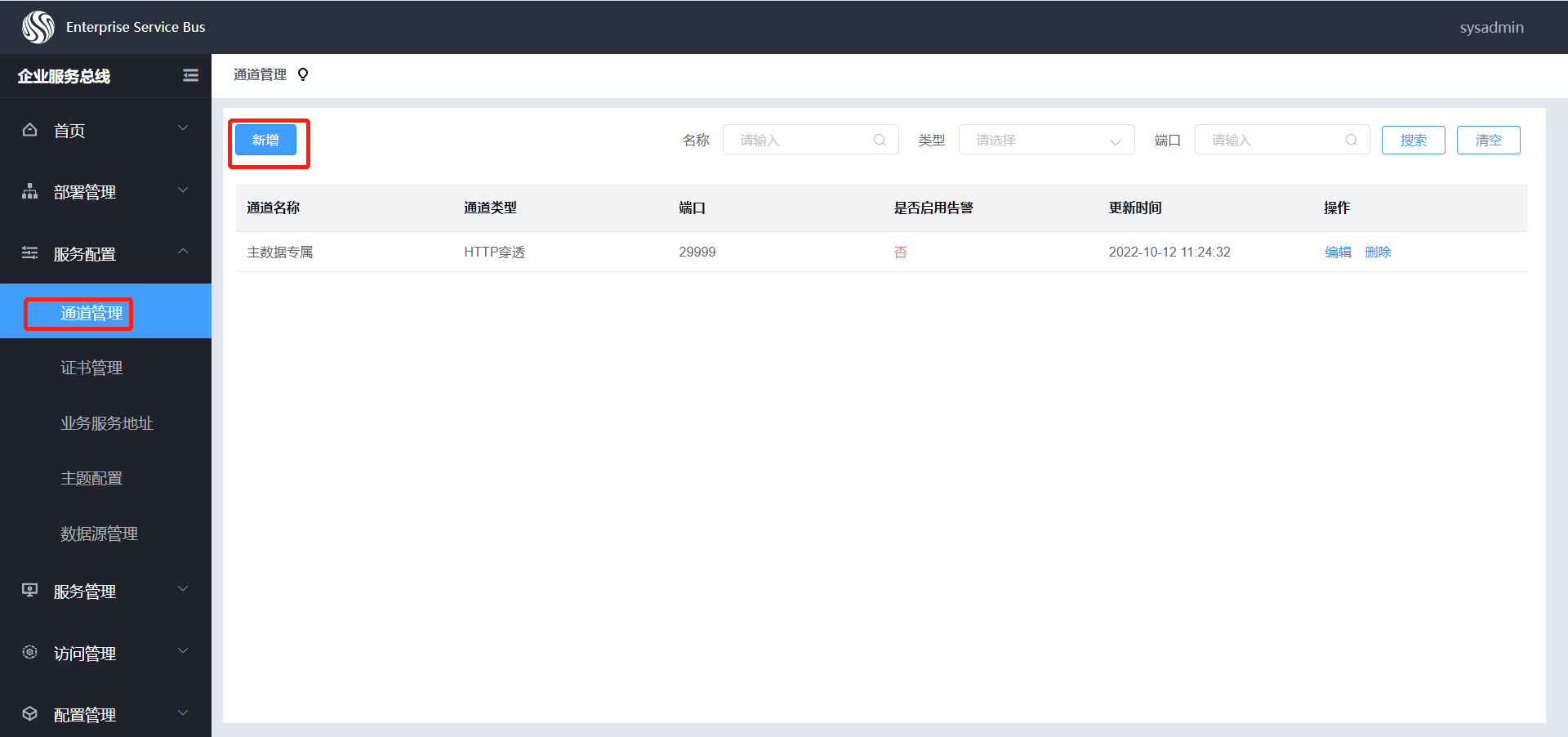 点击【服务配置->通道管理】进入通道管理界面,点击【新增】按钮,注册通道(类型选择HTTP穿透,协议选择HTTP)。