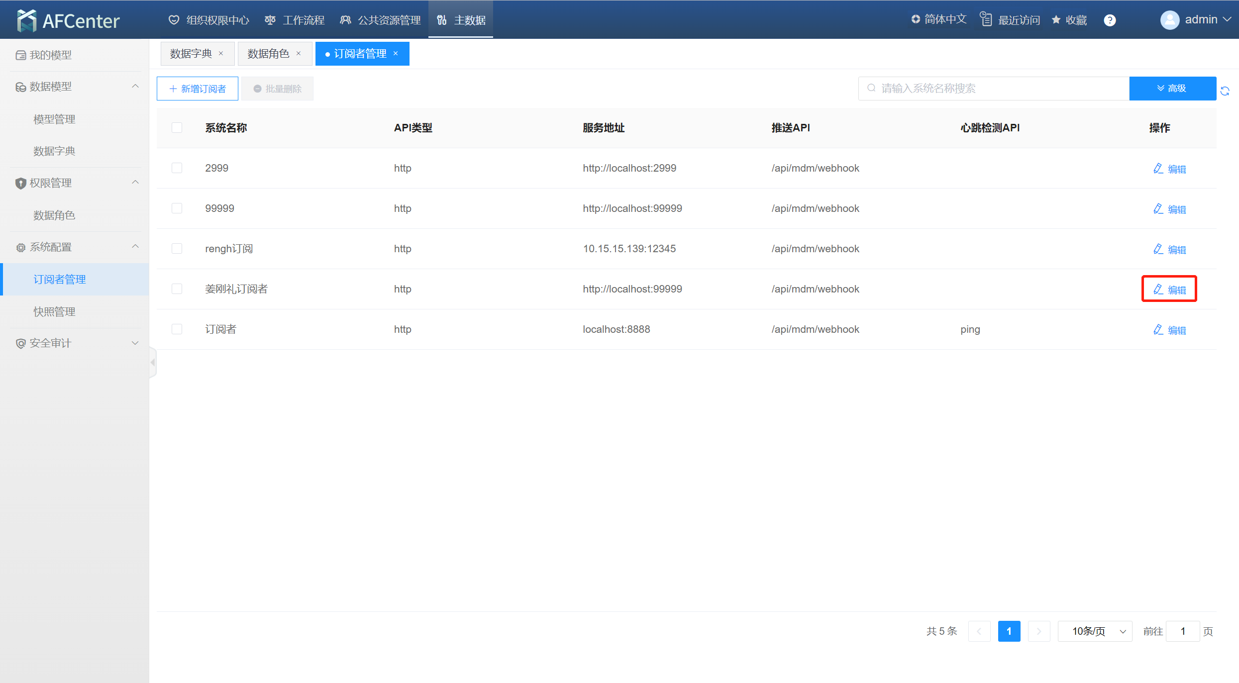 点击【系统配置】->【订阅者管理】进入订阅者管理页面。
