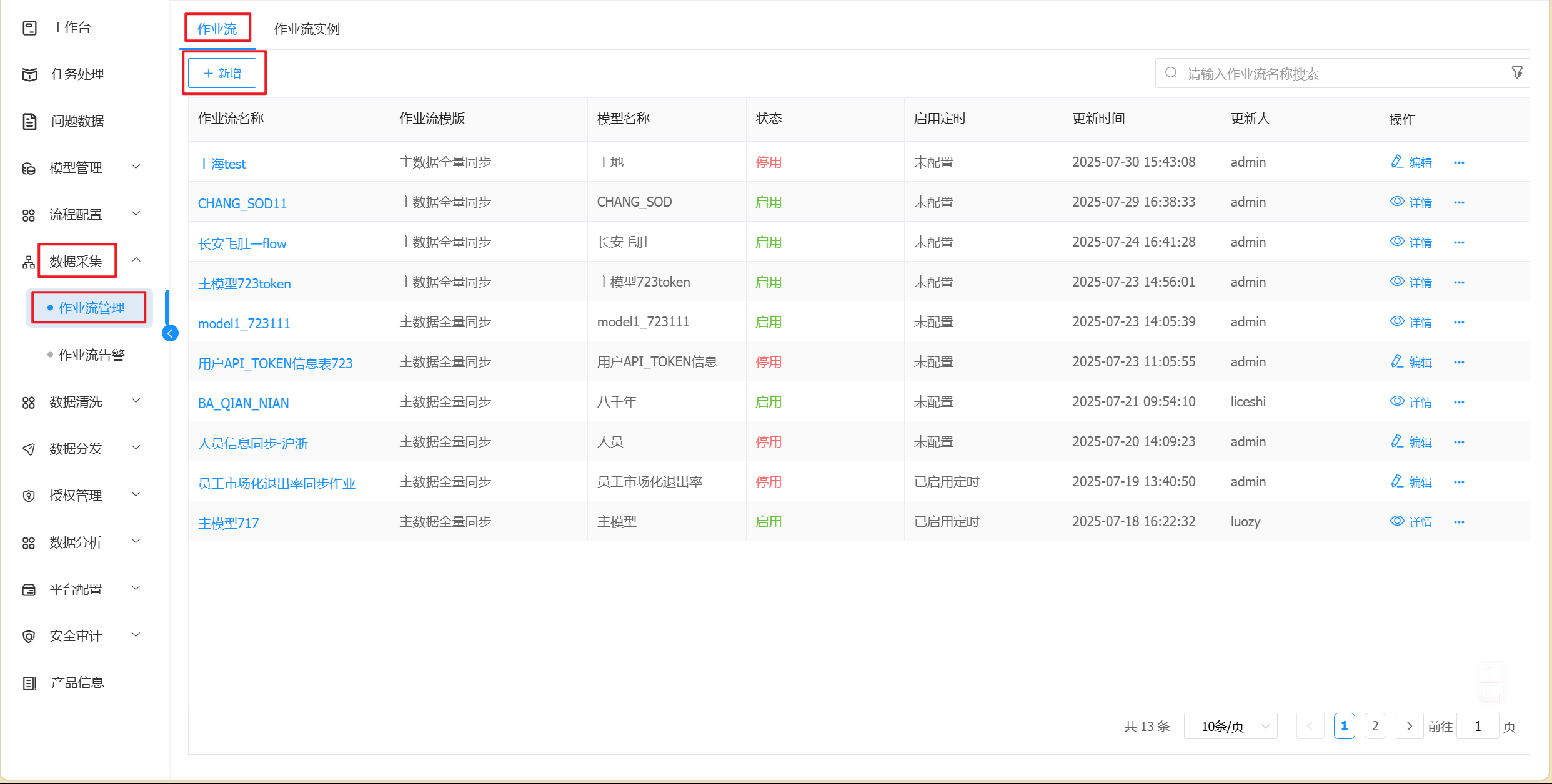 访问路径【主数据管理门户】→ 【数据采集】→【作业流管理】进入作业流页面。