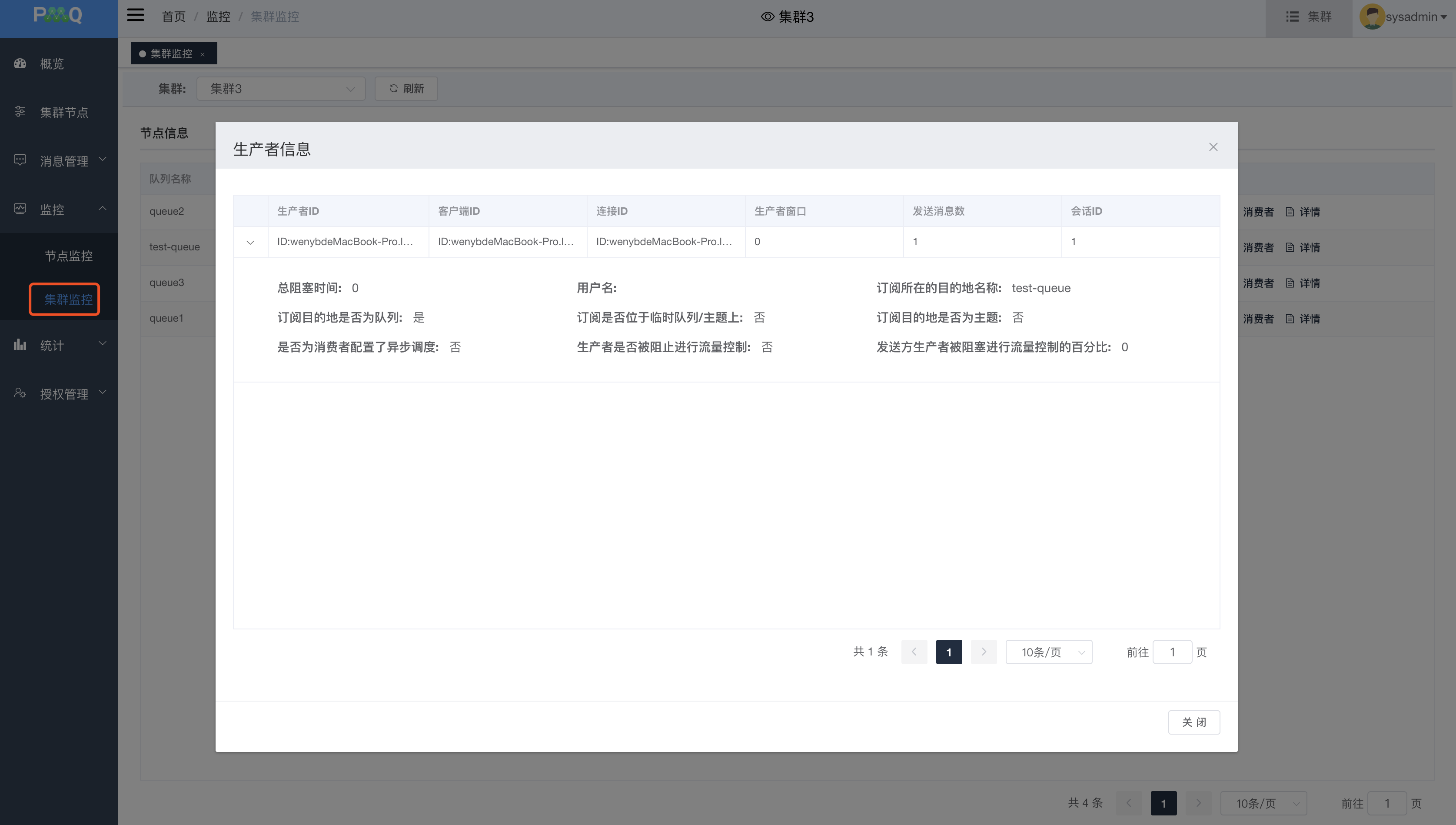 点击操作列的“生产者”按钮展示该队列的生产者信息。