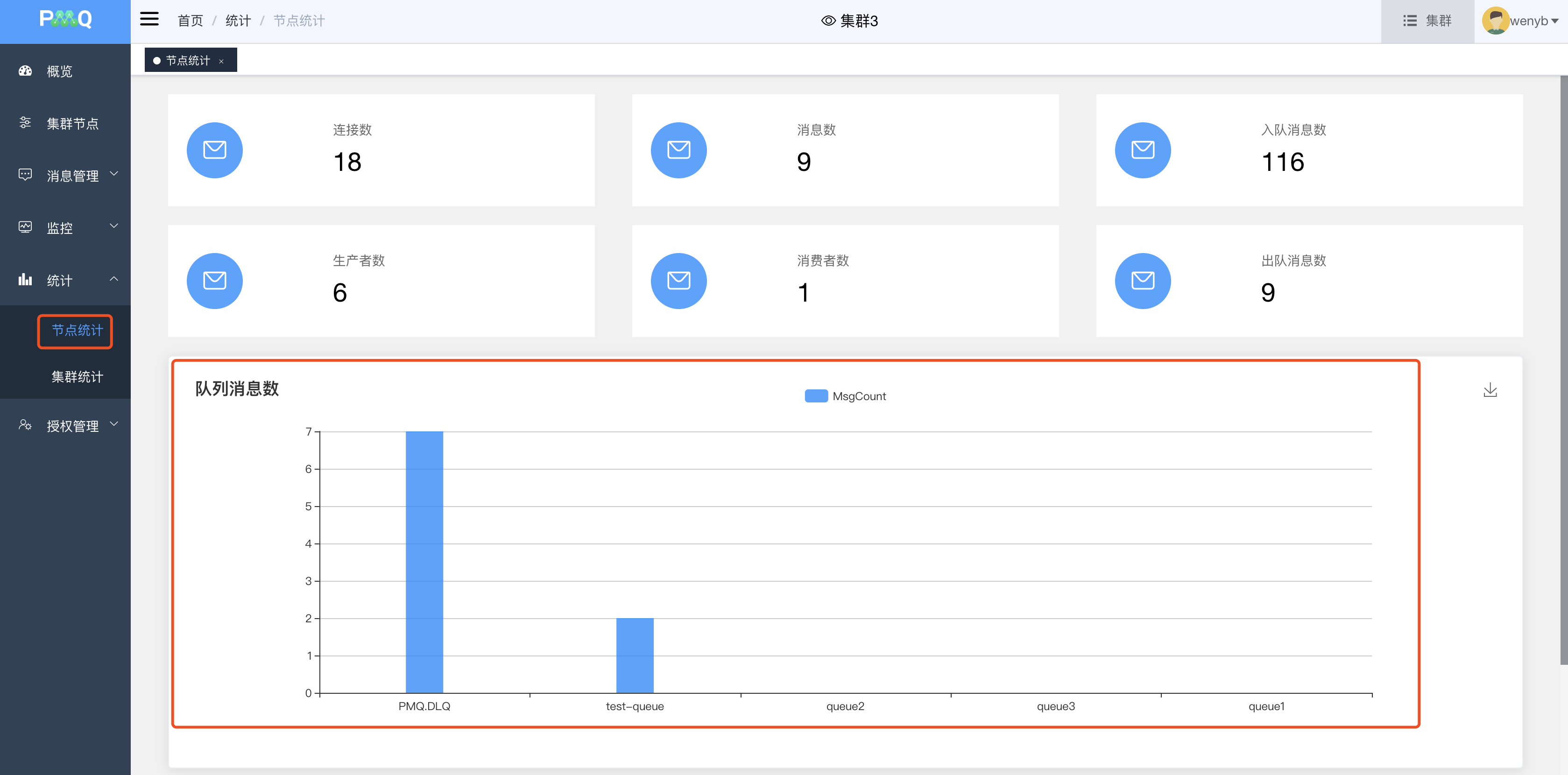 单击左侧导航树上的 “ 统计 > 节点统计 ” ,右侧区域显示 “节点统计 ” 界面,“节点统计”显示当前集群下主节点的所有连接数、消息数、生产者数、消费者数以及集群主节点上队列中的待消费消息的条形图和走势图。