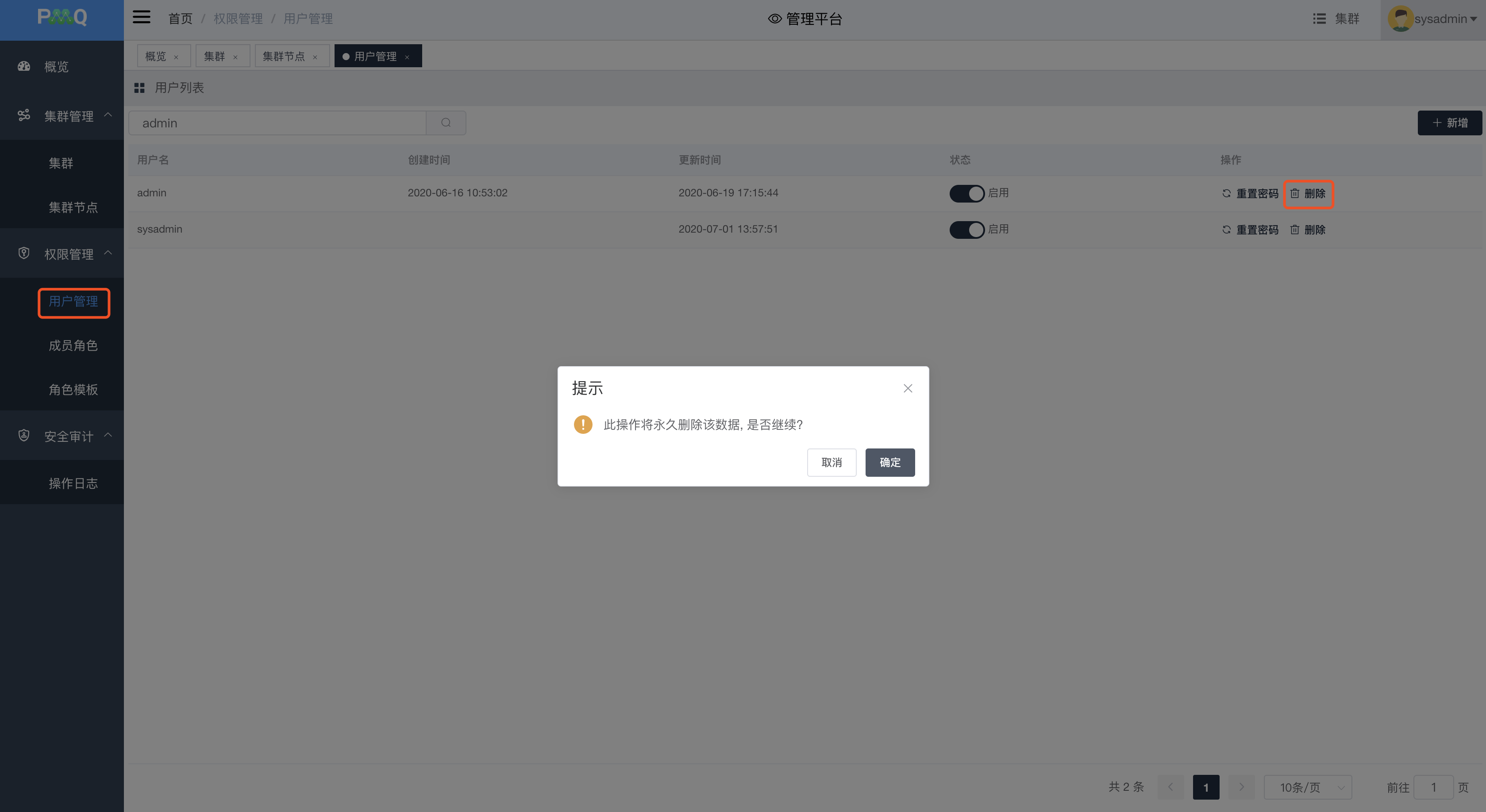 点击用户列表操作列中的“删除”按钮,弹出删除确认提示框,点击“确定”按钮后,即可删除该行所在的用户。